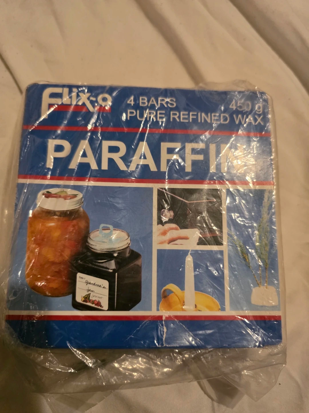 Selling a package of Flixo Paraffin Wax, which contains 4 bars and weighs 450g. It's pure refined wax, perfect for various uses!