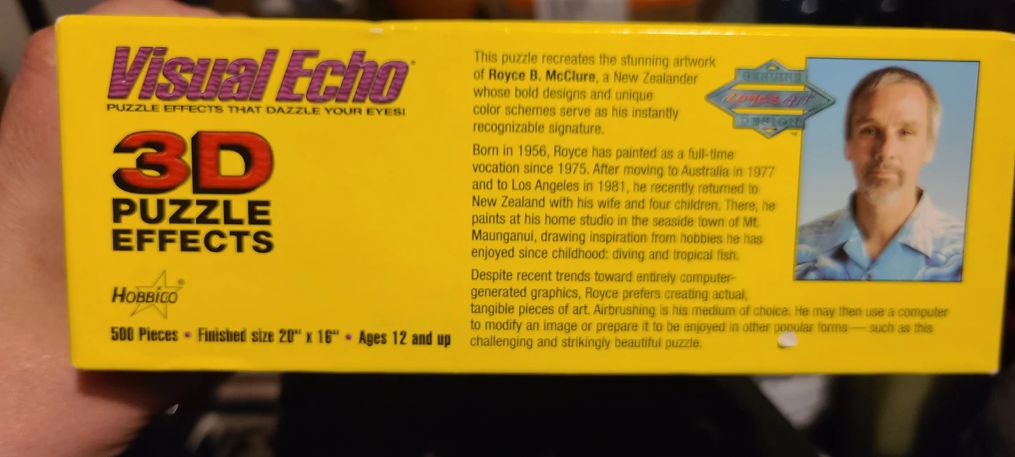 Visual Echo puzzle with 3D effects! It's a 500-piece puzzle that's sure to dazzle your eyes. The finished puzzle size is 20" x 16". The box includes"Wonderland". Great for ages 12 and up
