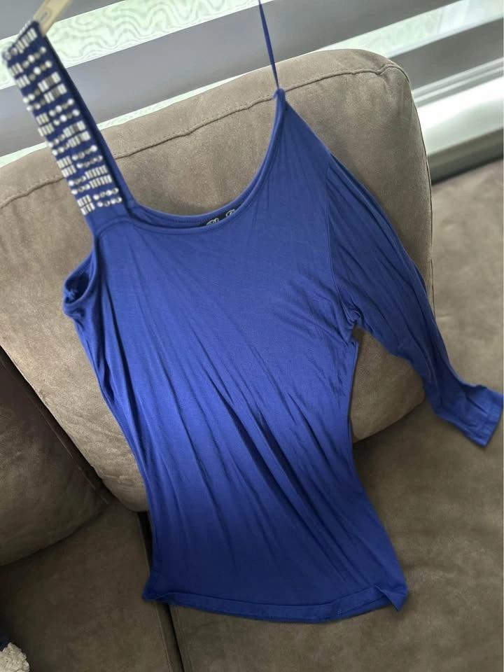 Blue one long sleeve shirt with sparkles on the upper side shoulder level. Could be use as a shirt or a dress depending on person’s height. Used only one time. Medium women size.