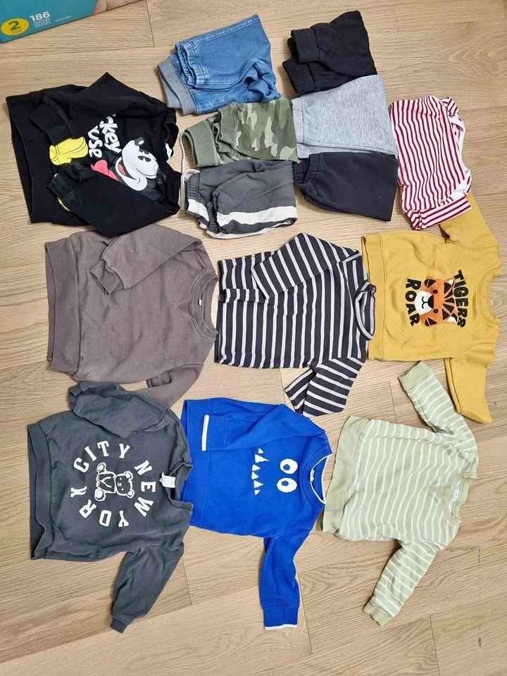 Size 12-18m to 2T/90cm clothes, all fits around 18m-2T for my son. A range of conditon from good to like new, a couple pieces don't wash as well (the ones with a cartoon print cracked from being in the dryer). Mostly from muji, gap, uniqlo.