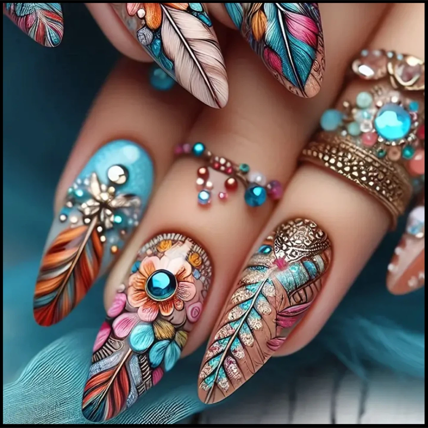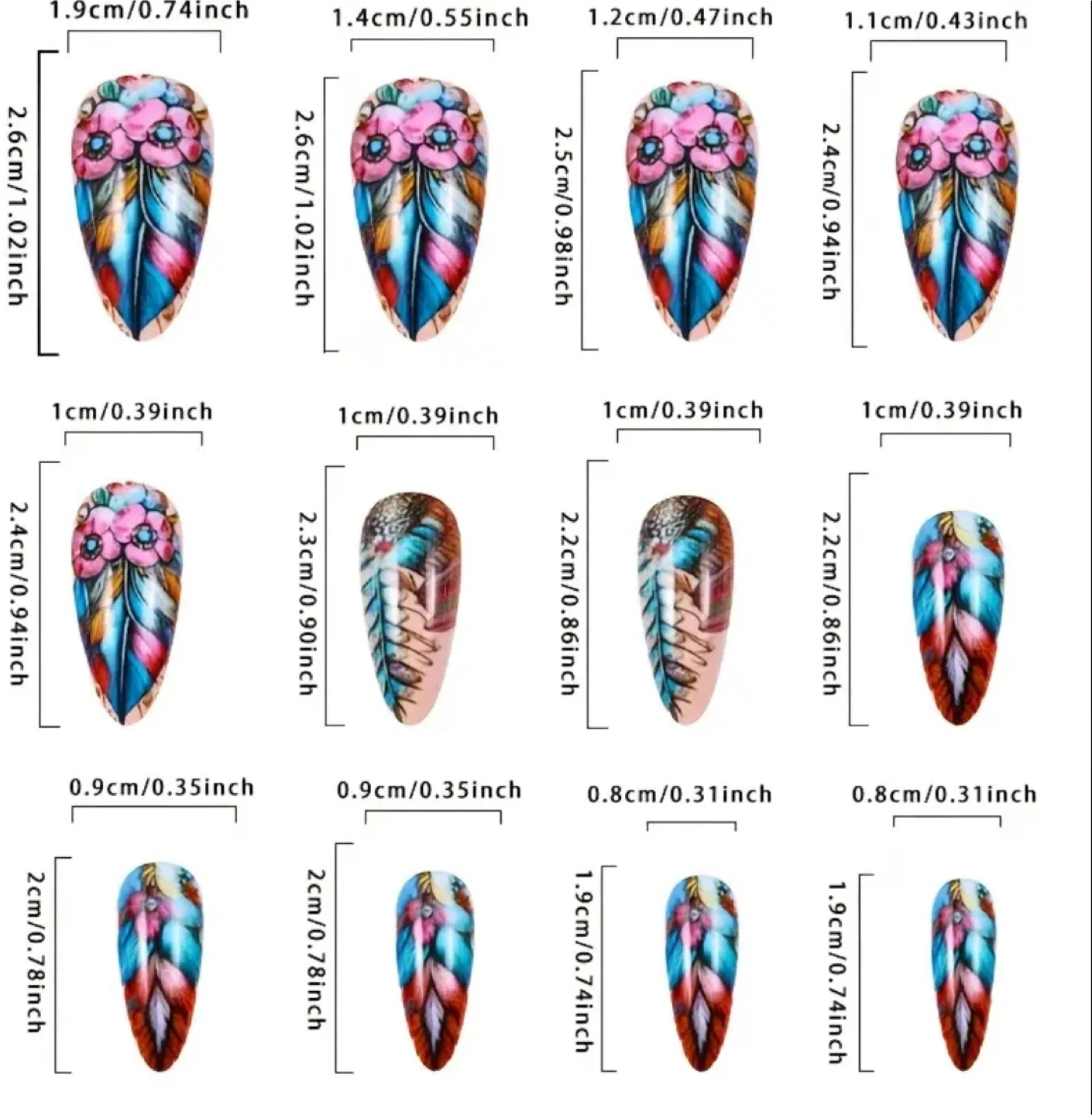 Selling a set of beautiful press-on nails with a unique feather and floral design. The set includes various sizes to ensure a perfect fit. These nails are perfect for adding a touch of elegance to any outfit!