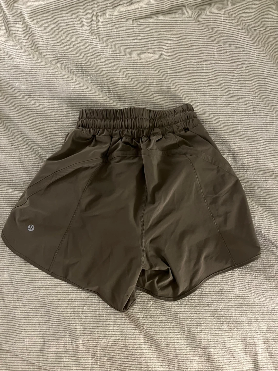 Selling a pair of Lululemon high rise lined shorts in an olive green colour. These are a size 6 (size small - fits 26-27 inch waist). In like new condition (worn less than 5 times). Perfect for running or just lounging around.