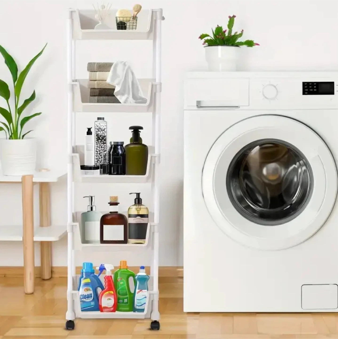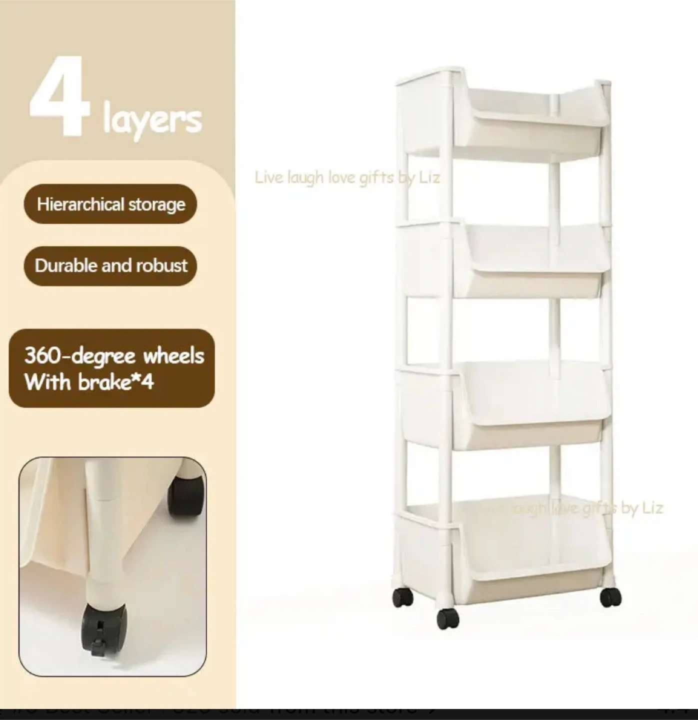 This is a handy 4-layer rolling storage cart in white! It's great for organizing items in any room. It features hierarchical storage and durable and robust construction. The 360-degree wheels with brakes make it easy to move around and keep it in place where you need it