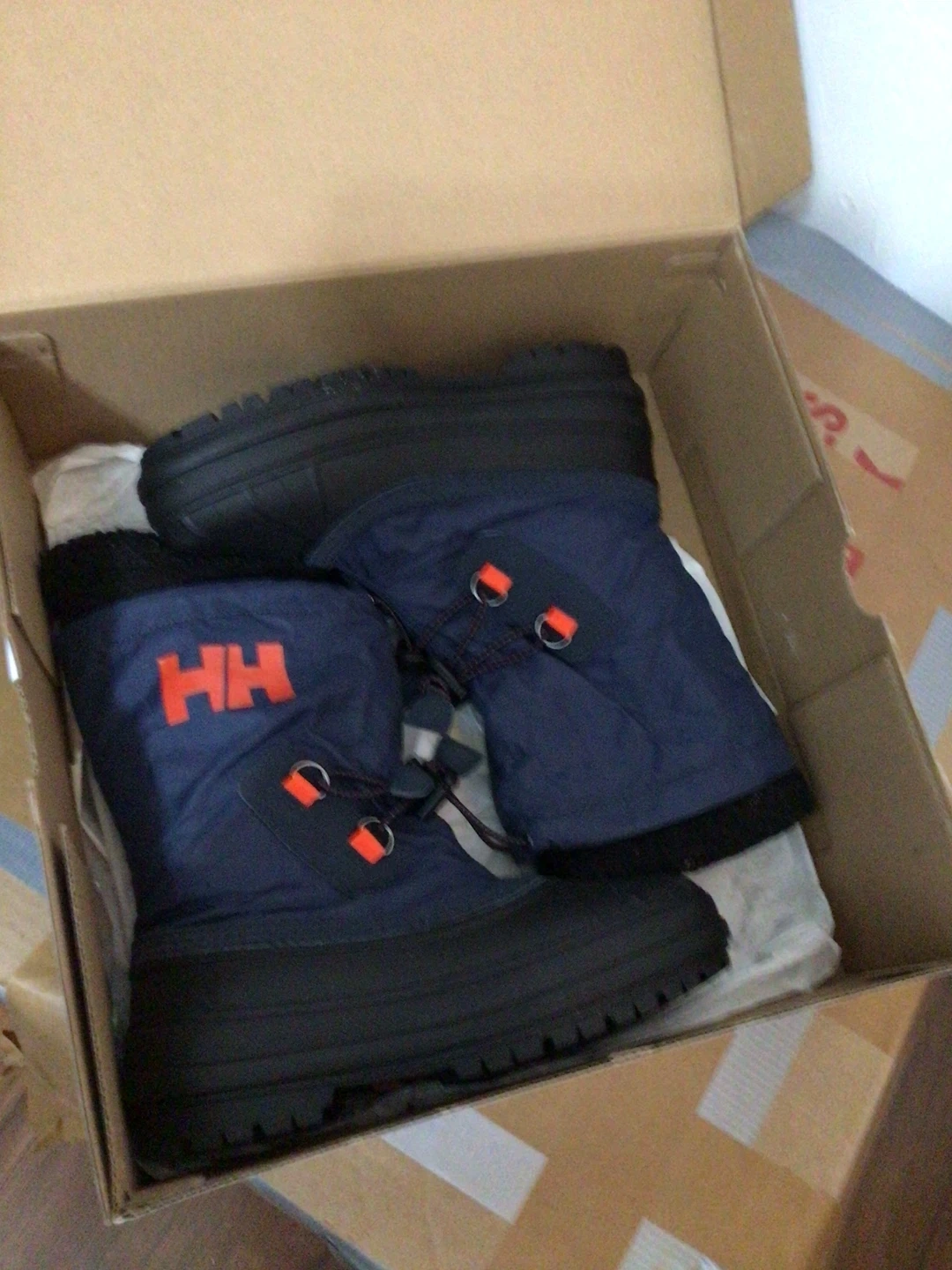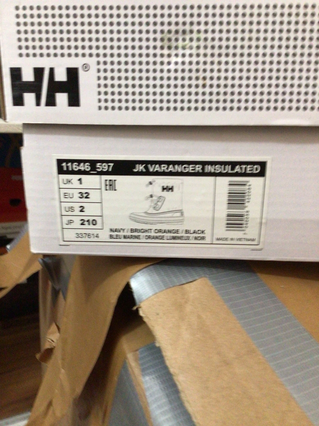 Selling a pair of Helly Hansen JK Varanger Insulated boots in a size US 2. They come in a navy, bright orange, and black colour combination. The boots are in great condition and come with the original box