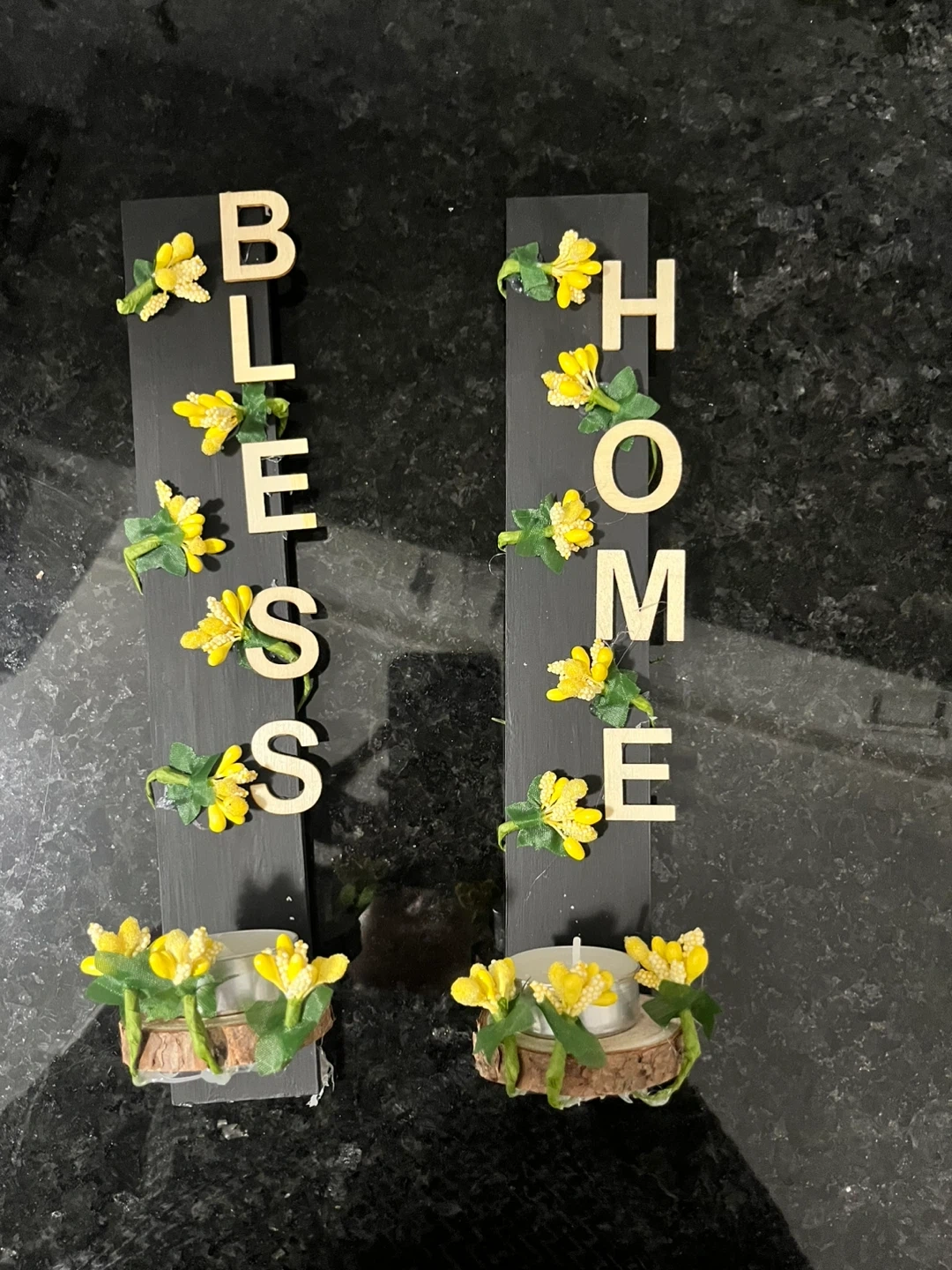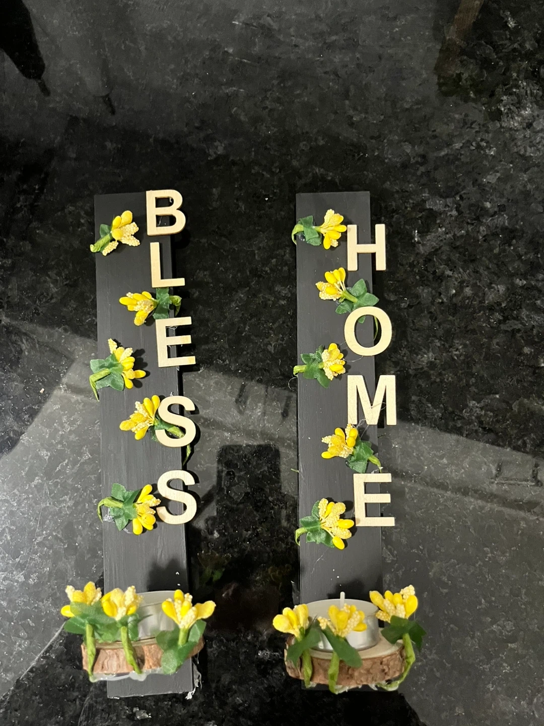 Cute candle holders for home decor. They say 'Bless Home' with little yellow flowers. Would look great on a shelf or table!