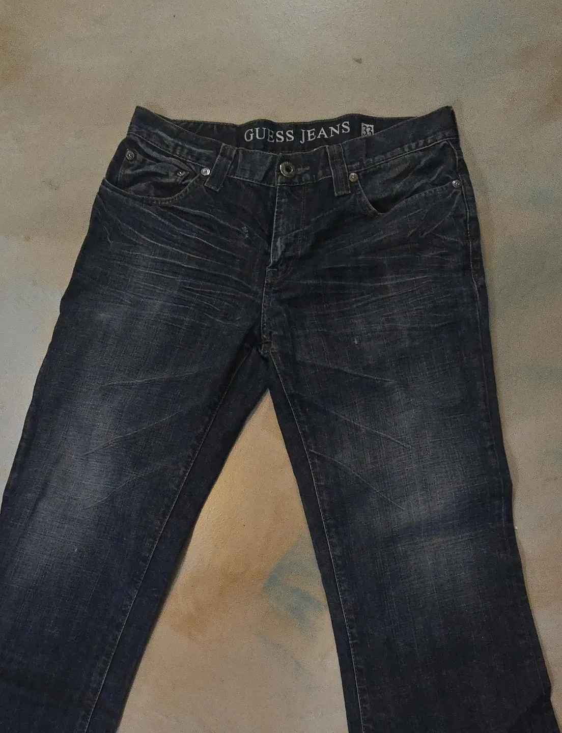 Selling a pair of Guess jeans in size 33! They're in great condition and ready for a new owner. Perfect for everyday wear! Slight wear hole at bottom left leg.