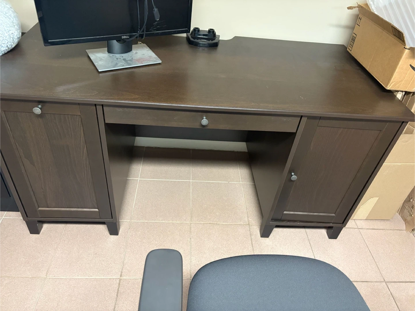 Selling a sturdy brown wooden desk. It features a drawer and cabinet space for storage. Great for a home office or study area