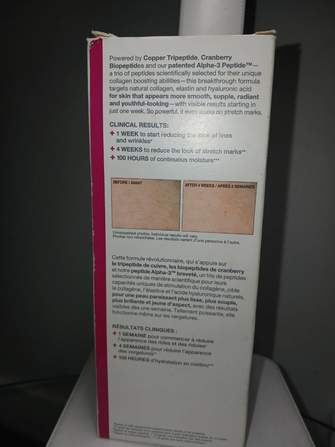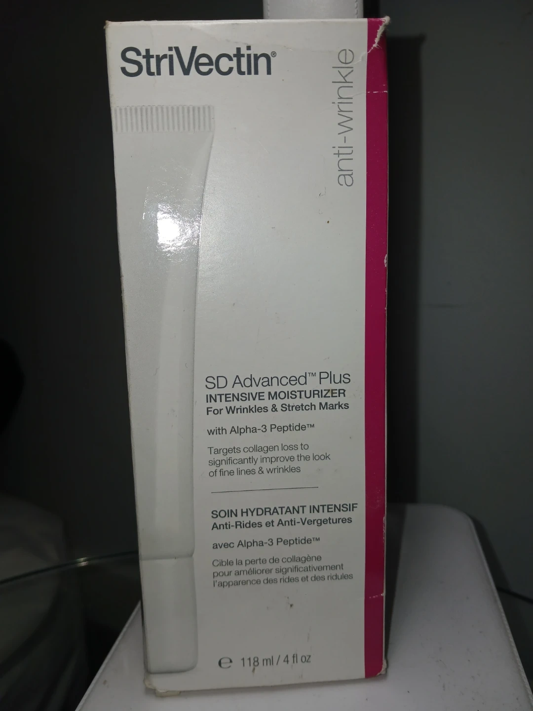 Selling a StriVectin SD Advanced Plus Intensive Moisturizer for wrinkles and stretch marks. This moisturizer targets collagen loss to significantly improve the look of fine lines and wrinkles. It contains Alpha-3 Peptide™ and is powered by Copper Tripeptide and Cranberry Biopetide. The box indicates clinical results showing reduction in the look of lines and wrinkles in one week and reduction in the look of stretch marks in four weeks, with 100 hours of continuous moisture. It comes in a 118 ml / 4 fl oz size