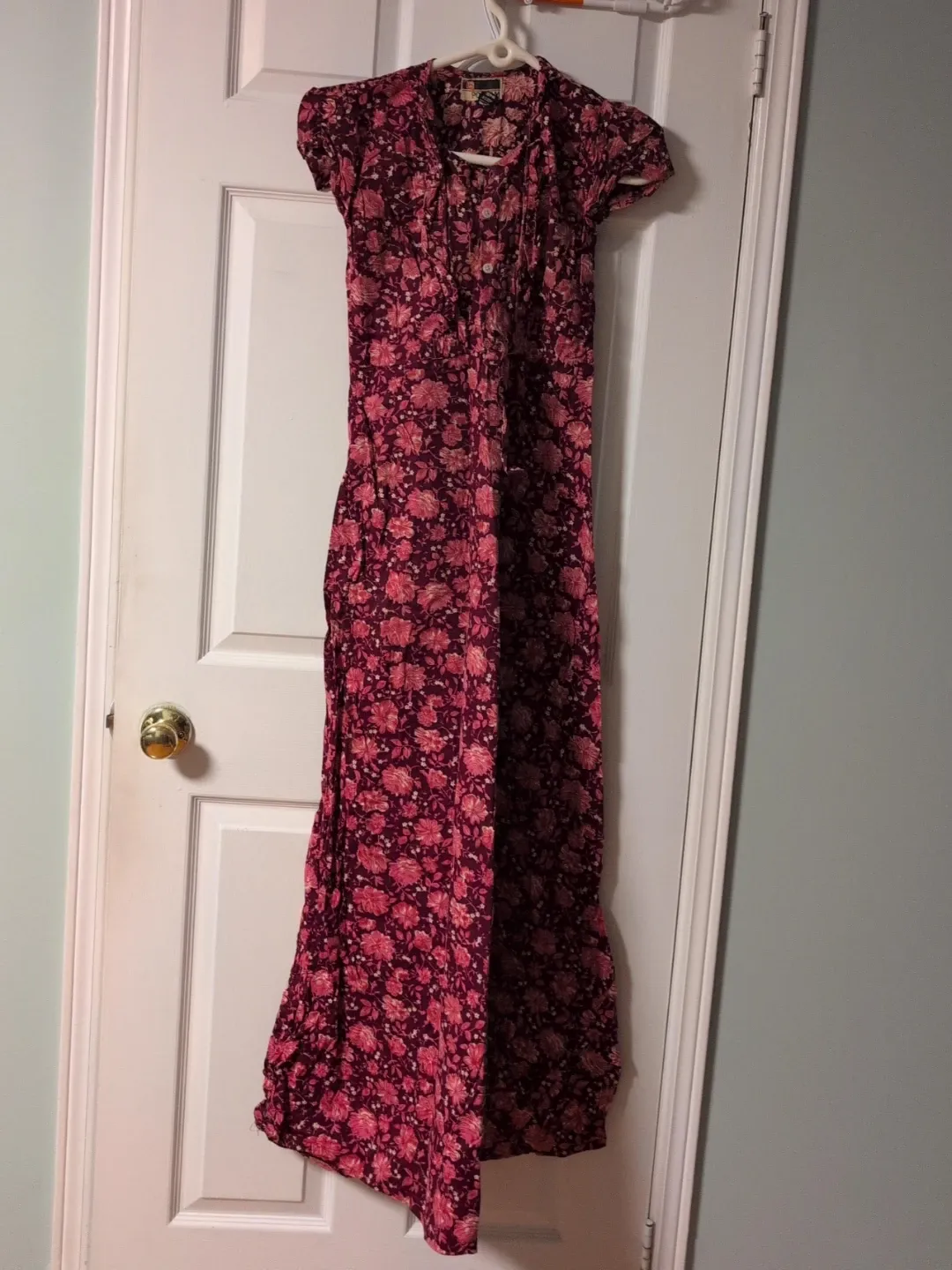 This is a beautiful floral maxi dress in a maroon and pink colour palette. It's perfect for a casual day out or a summer evening. The dress features a button-down front and short sleeves. It's in great condition and ready for a new home!