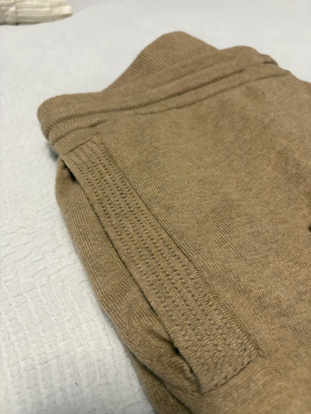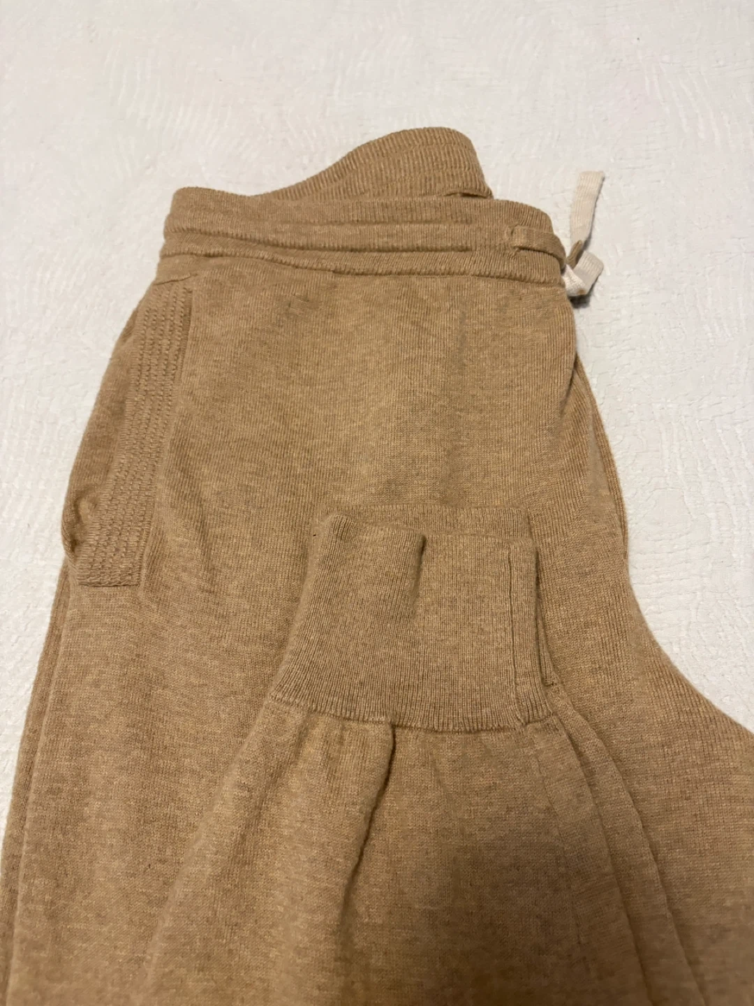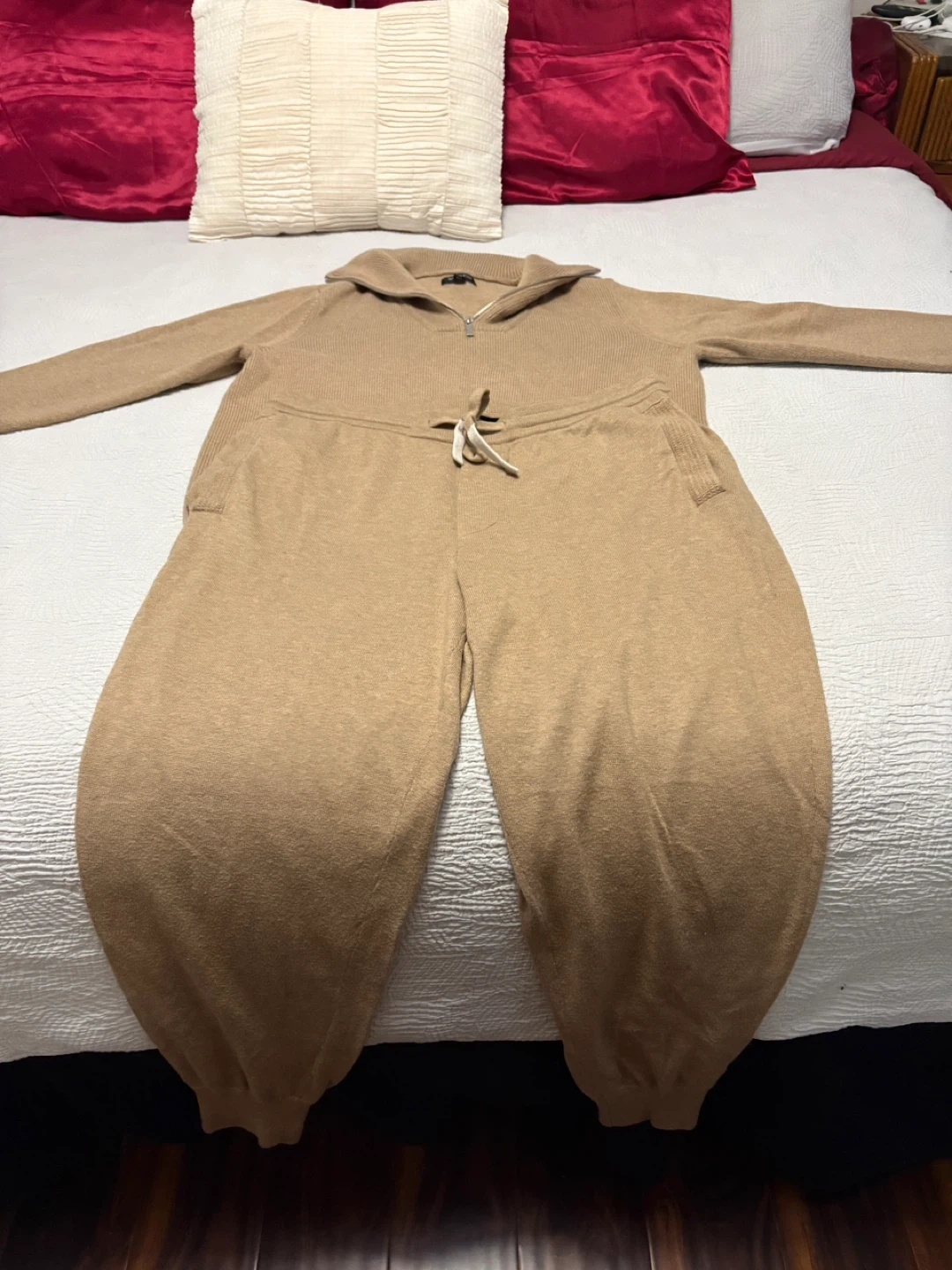 The sweater is size M/M and the pants are size L/G. The set is a lovely neutral colour and made of 55% cotton and 45% acrylic.