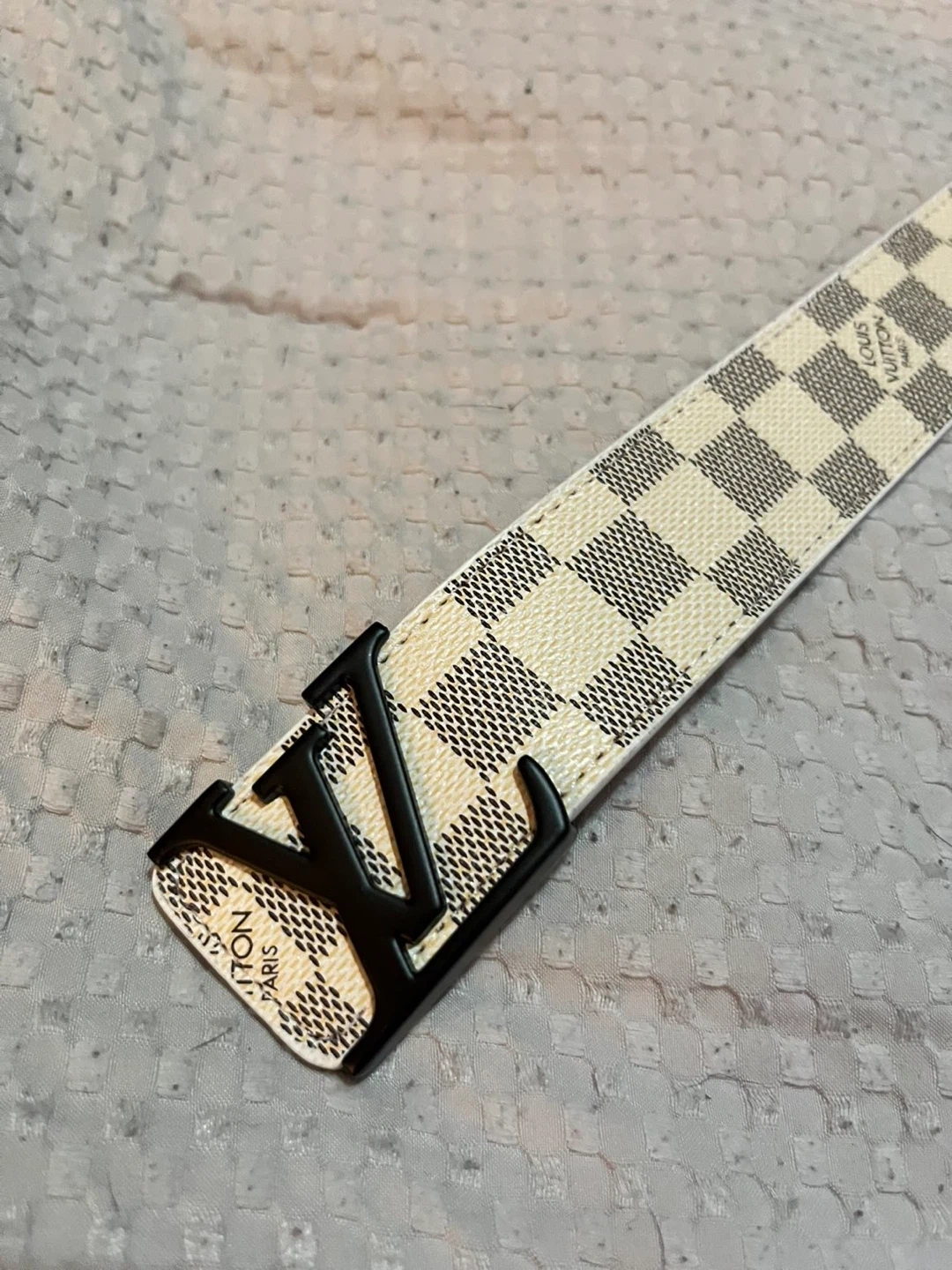 Selling a Louis Vuitton belt in the Damier Azur pattern. It's reversible with a tan leather on the other side. The buckle is black. It's in perfect condition