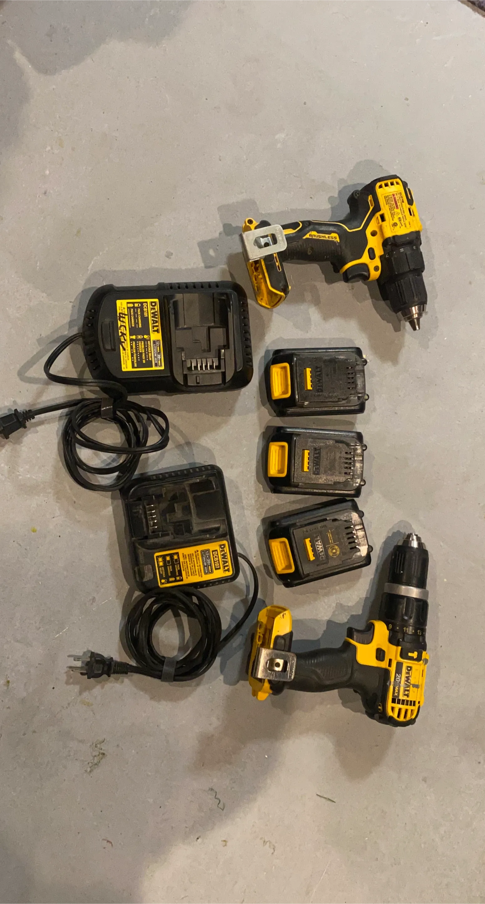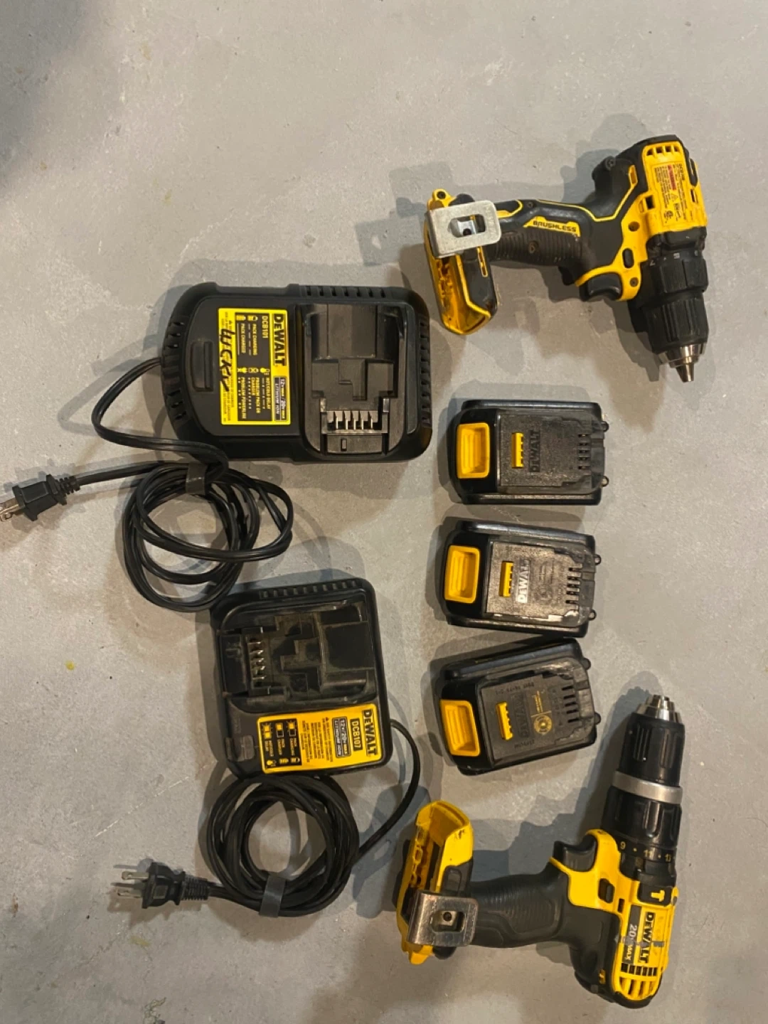 Selling a DeWalt 20V MAX cordless drill combo kit. It includes two drills, 3 batteries, and 2 chargers. Great for any DIY projects around the house!