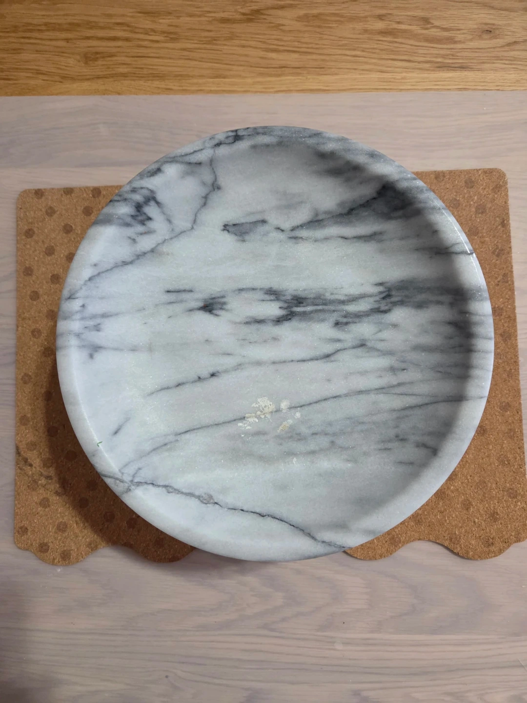 Bowl of cool white marble with unique grey veining rests atop a traditional pedestal for a grand presentation of fruits and decorative objects. Note that exposure to the acid of cut citrus fruits can stain marble.