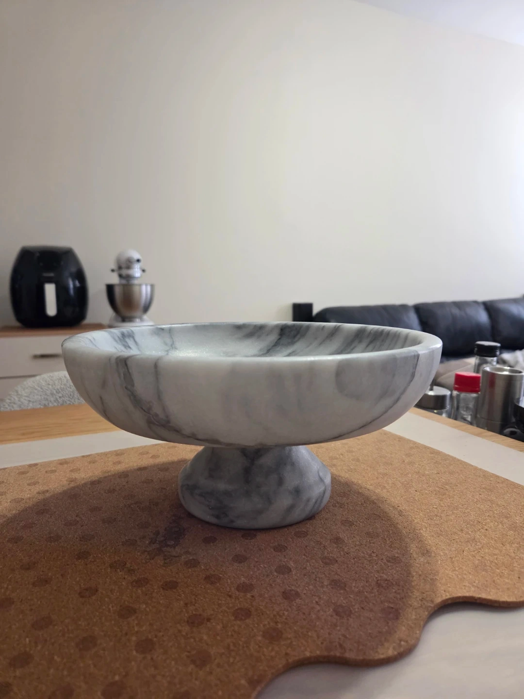 Bowl of cool white marble with unique grey veining rests atop a traditional pedestal for a grand presentation of fruits and decorative objects. Note that exposure to the acid of cut citrus fruits can stain marble.