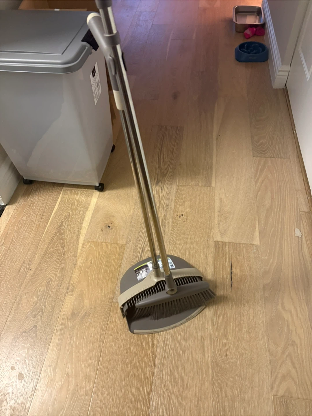 Selling a broom and dustpan set in good condition. It's perfect for quick cleanups around the house. The broom has sturdy bristles and the dustpan has a rubber lip to help sweep up all the dirt and debris