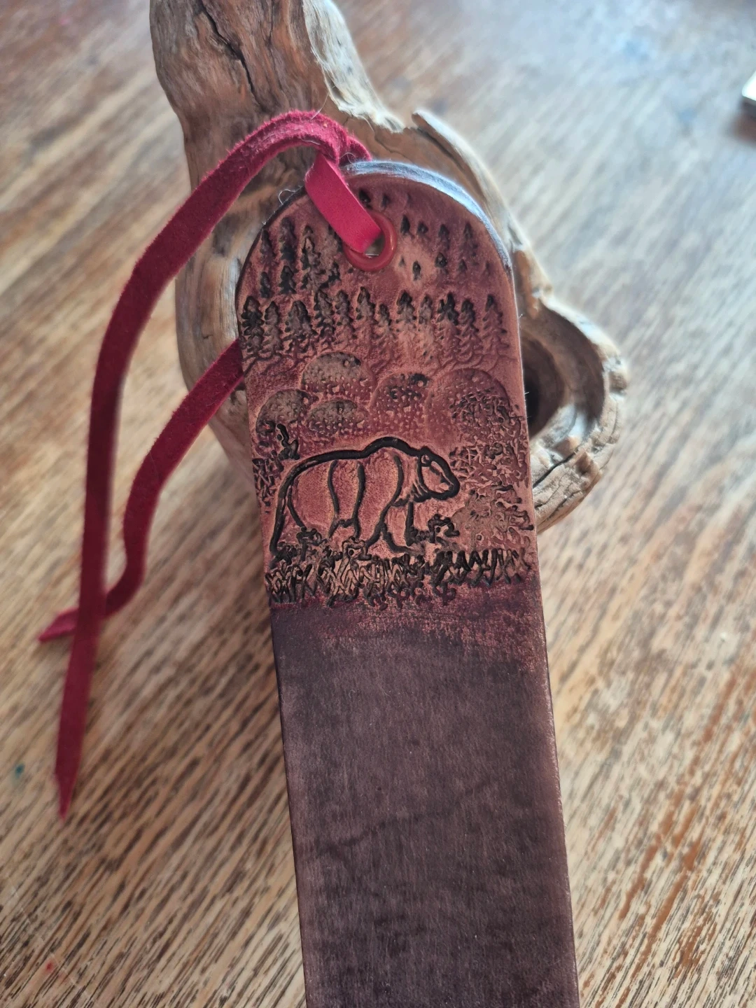 Check out this unique, handmade leather bookmark! It features a beautiful bear strolling a trail . The bookmark also has a soft red leather string attached. It's in great condition and ready to mark your favourite pages