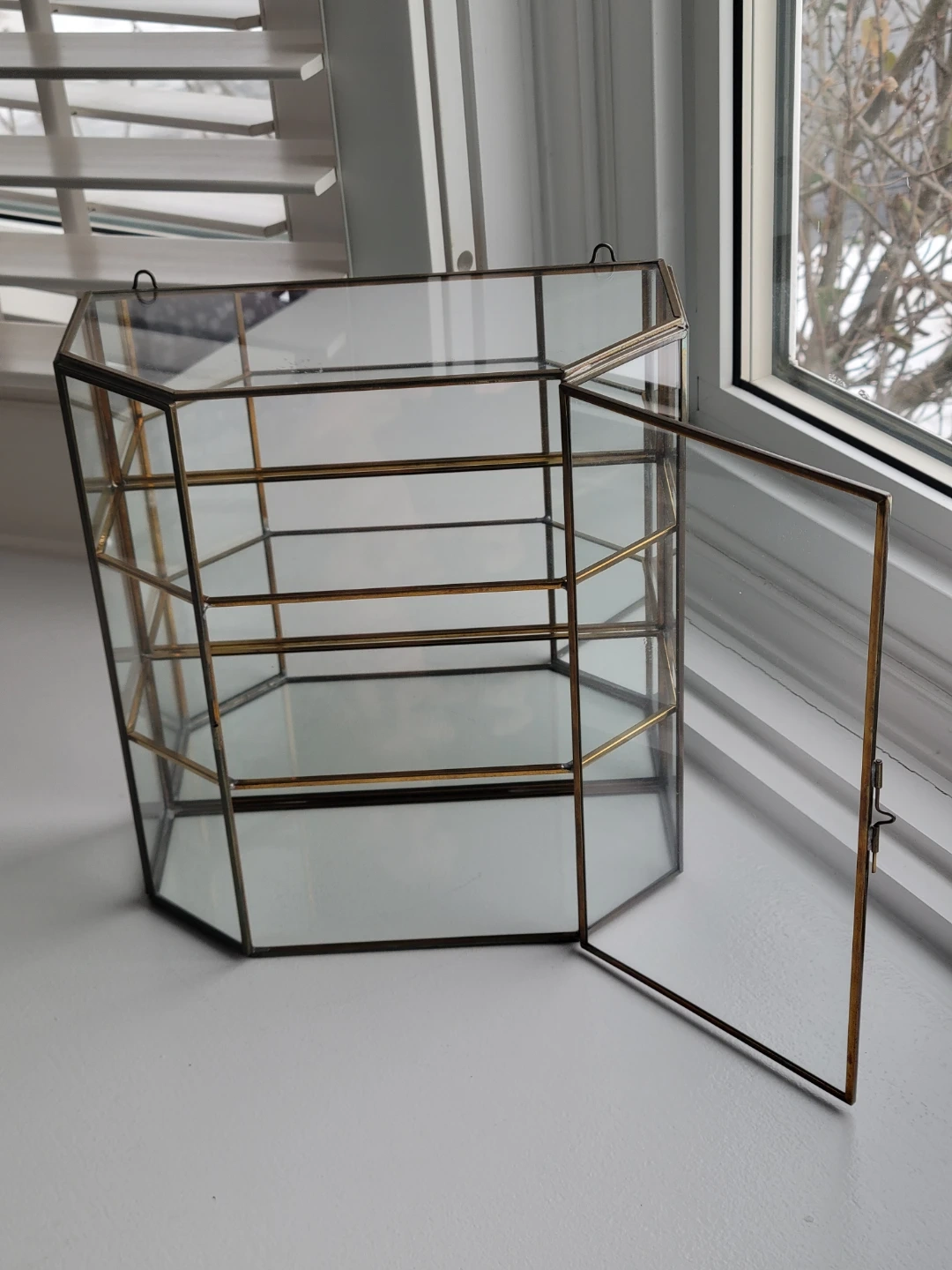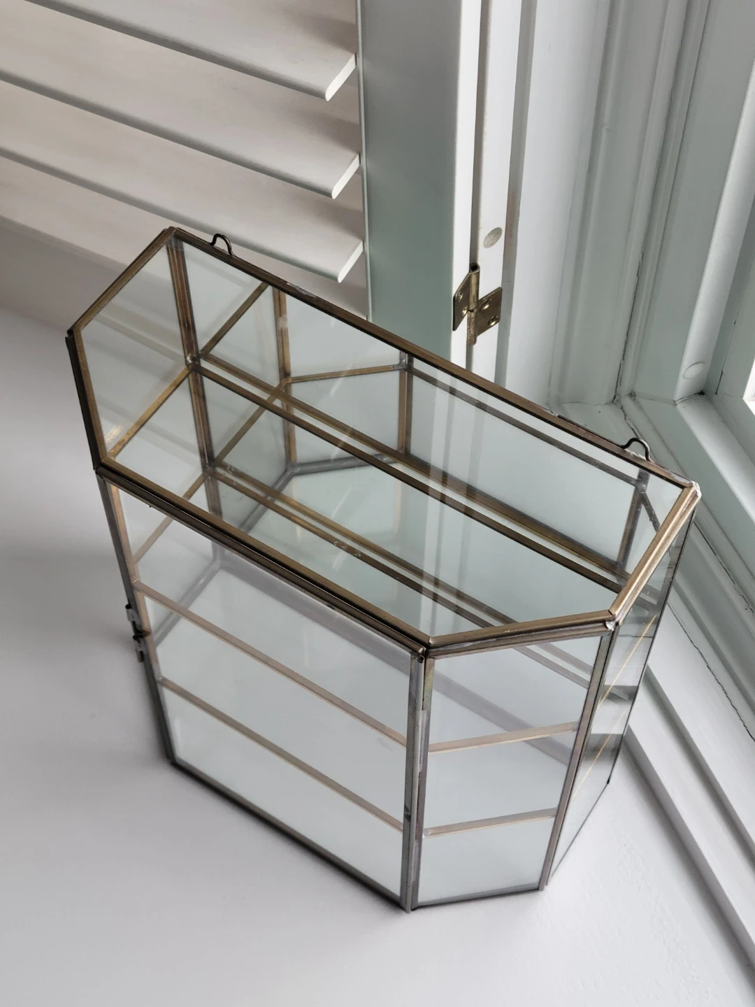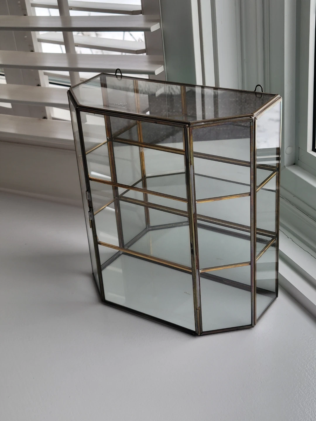 This is a vintage brass mirrored glass hanging curio cabinet, perfect for displaying your small treasures! It's in good condition, with a touch of antique charm, and ready to be the star of any room. The curio cabinet features glass shelving and a mirrored back to enhance the display of your items.