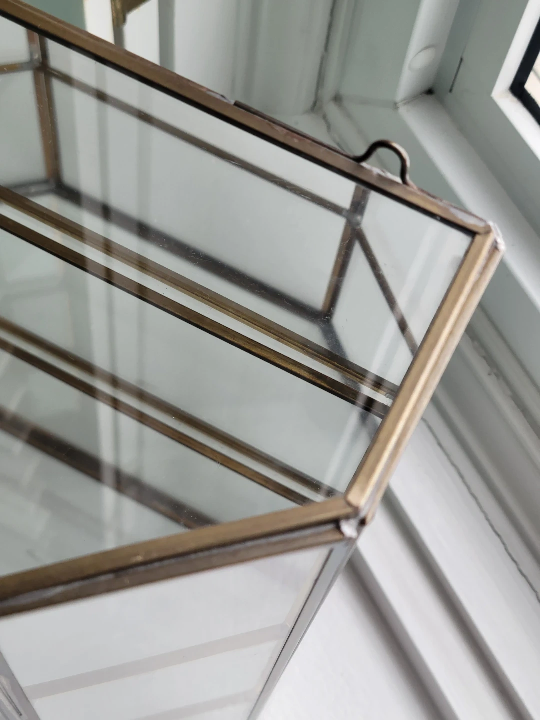 This is a vintage brass mirrored glass hanging curio cabinet, perfect for displaying your small treasures! It's in good condition, with a touch of antique charm, and ready to be the star of any room. The curio cabinet features glass shelving and a mirrored back to enhance the display of your items.