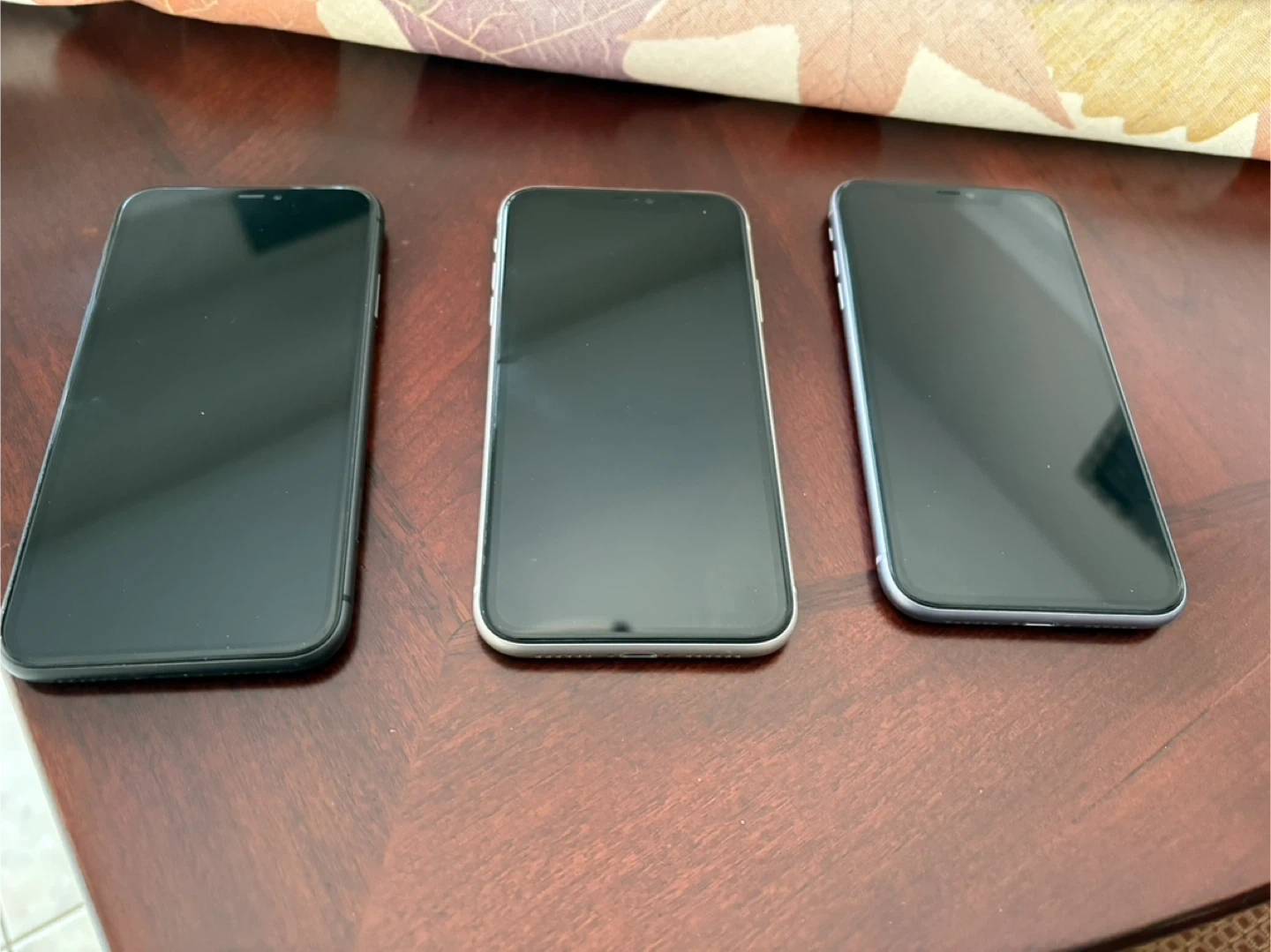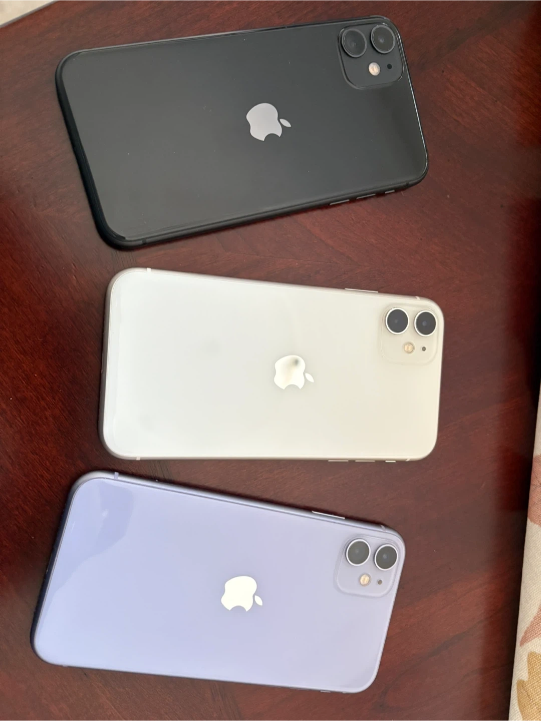 Selling three iPhone 11s in black, white, and purple. They're in excellent condition and ready for a new owner!