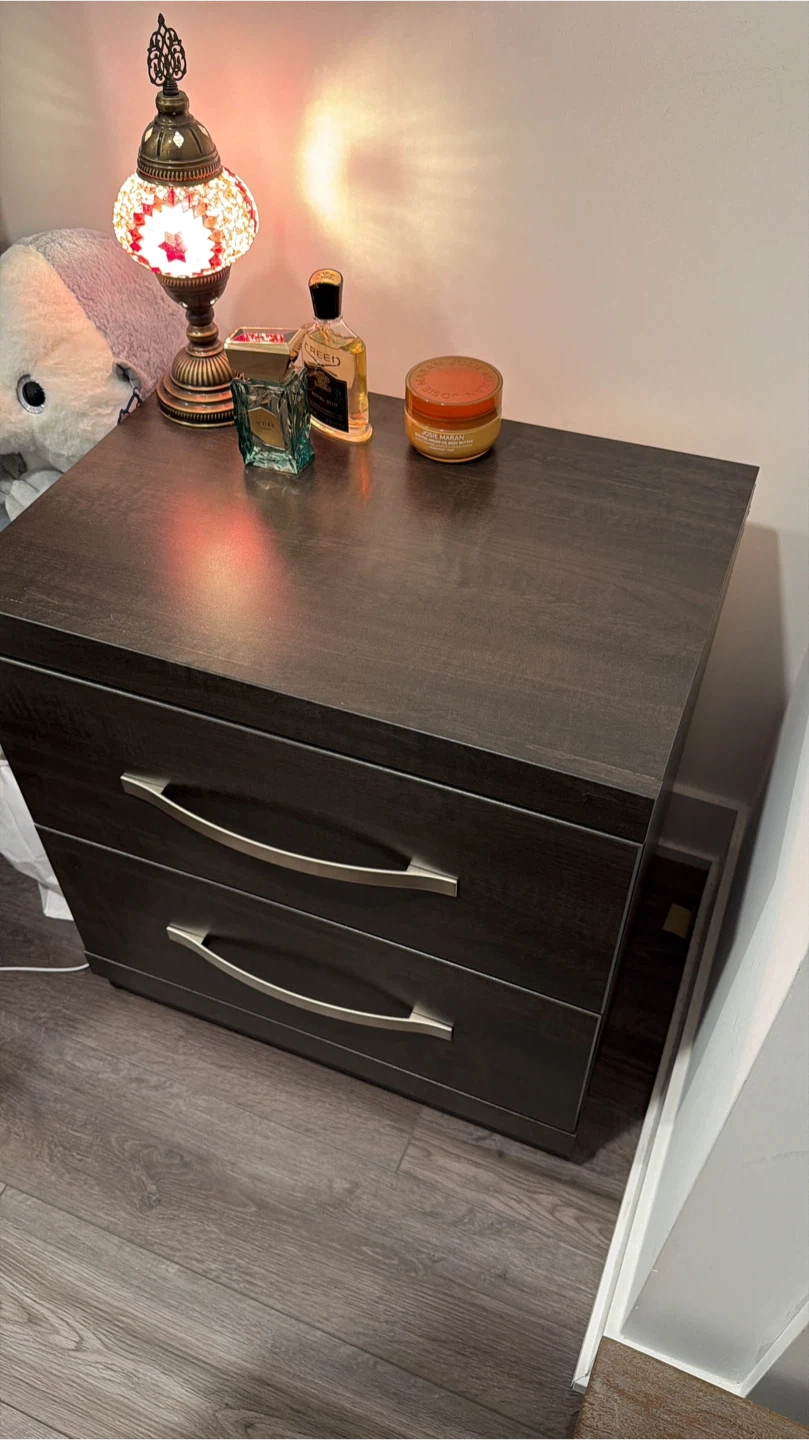 Here's a dark brown nightstand with two drawers. It's in great shape and ready to use in your bedroom or living space. Perfect for storing your bedside essentials or displaying decorative items!