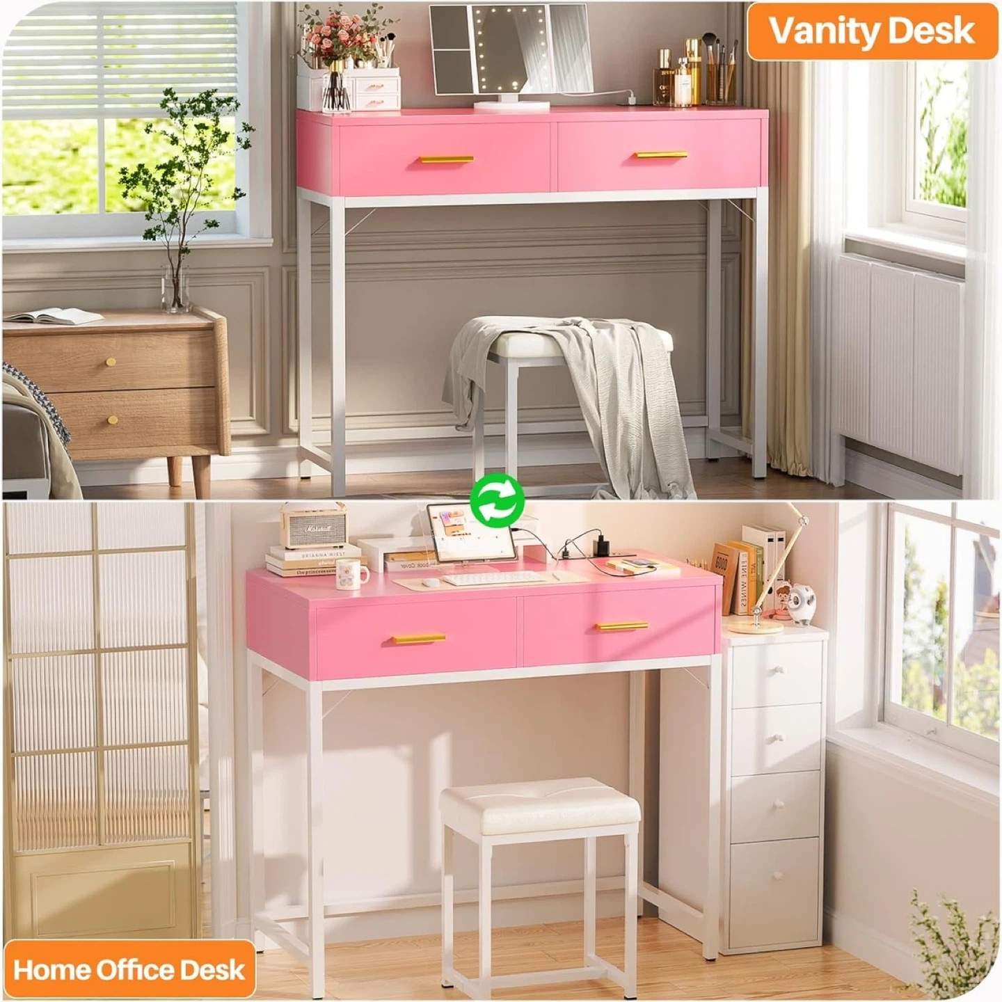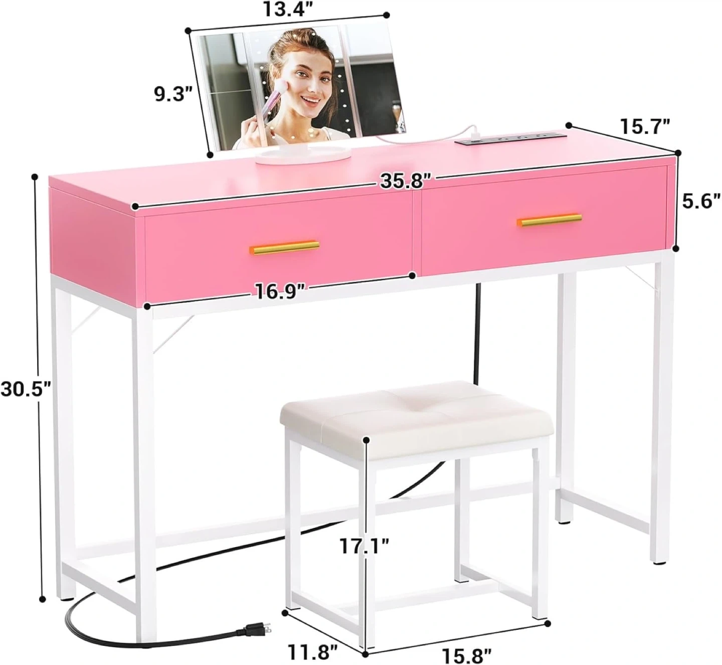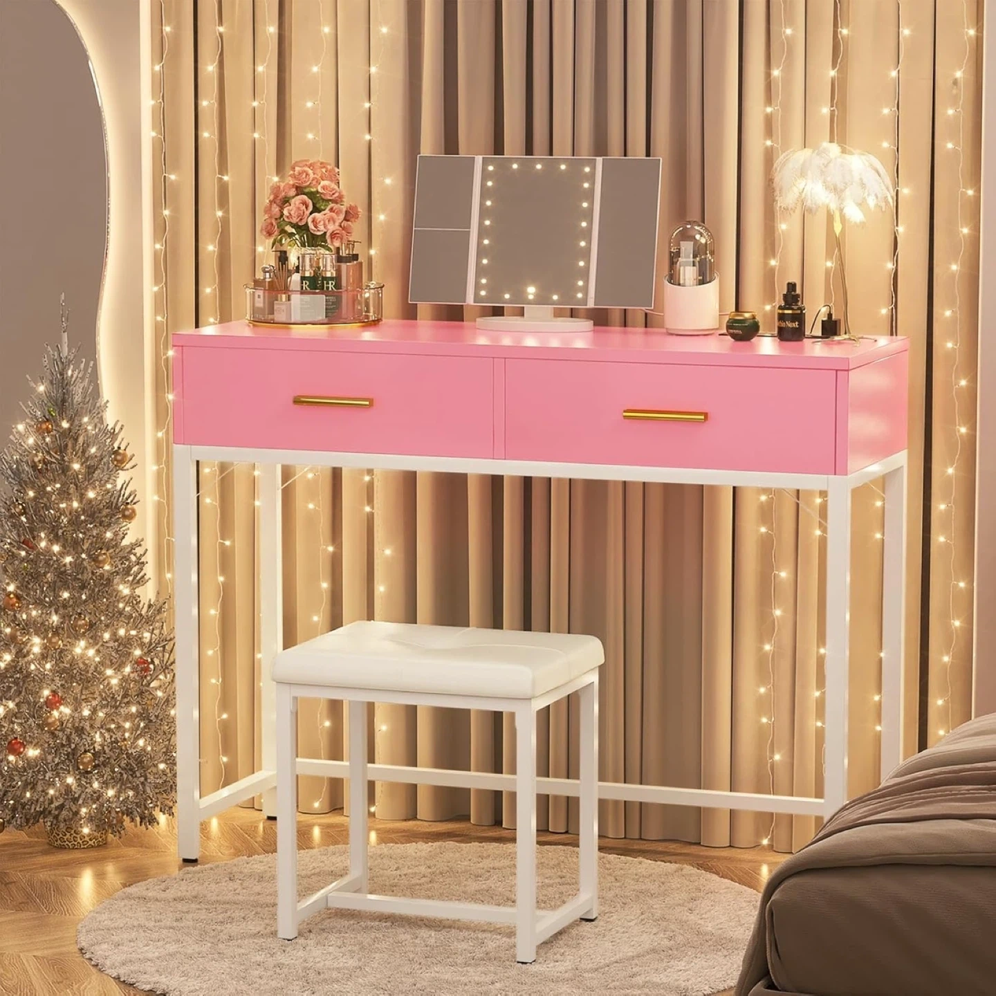 Selling a brand new Cyklisio vanity desk with stool! It's still in the box and ready to be assembled. The desk features a pink top with white legs and gold handles. The dimensions are 35.8" x 15.7" x 30.5". Perfect for a bedroom or home office