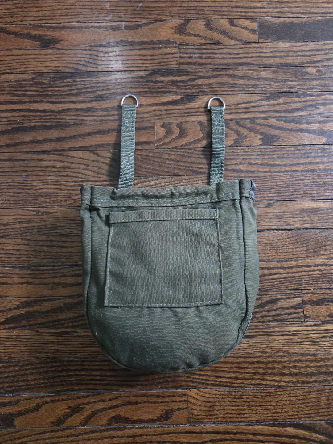Designed for easy attachment, it features two nylon webbing straps with snap and dee ring fasteners that hook onto your belt or harness. The top opening is reinforced with nylon rope for added strength, making this pouch a reliable choice for professionals in the field.