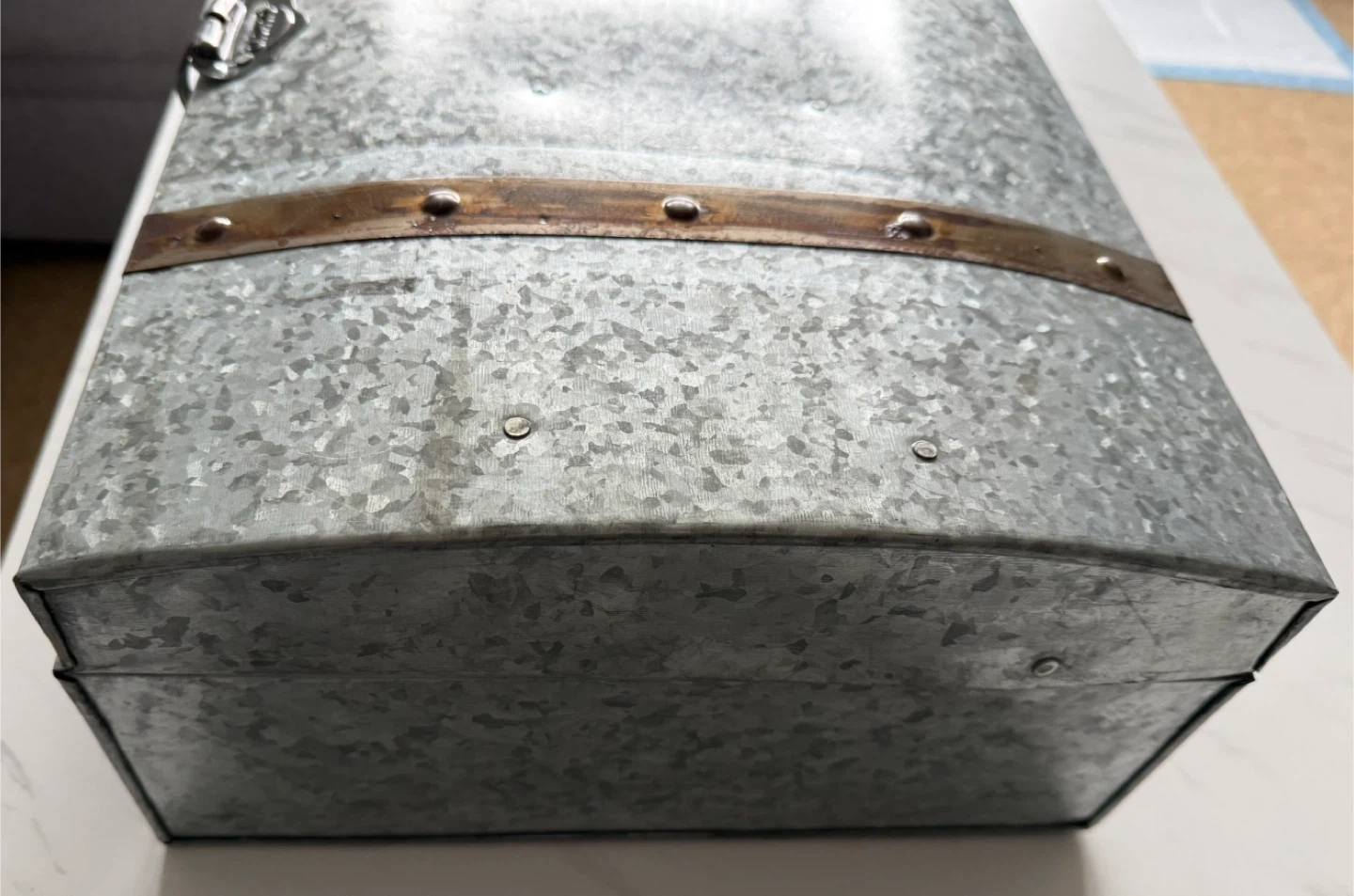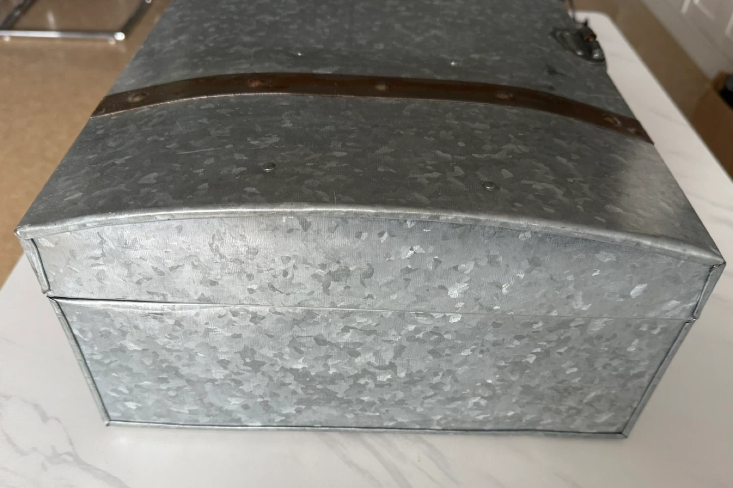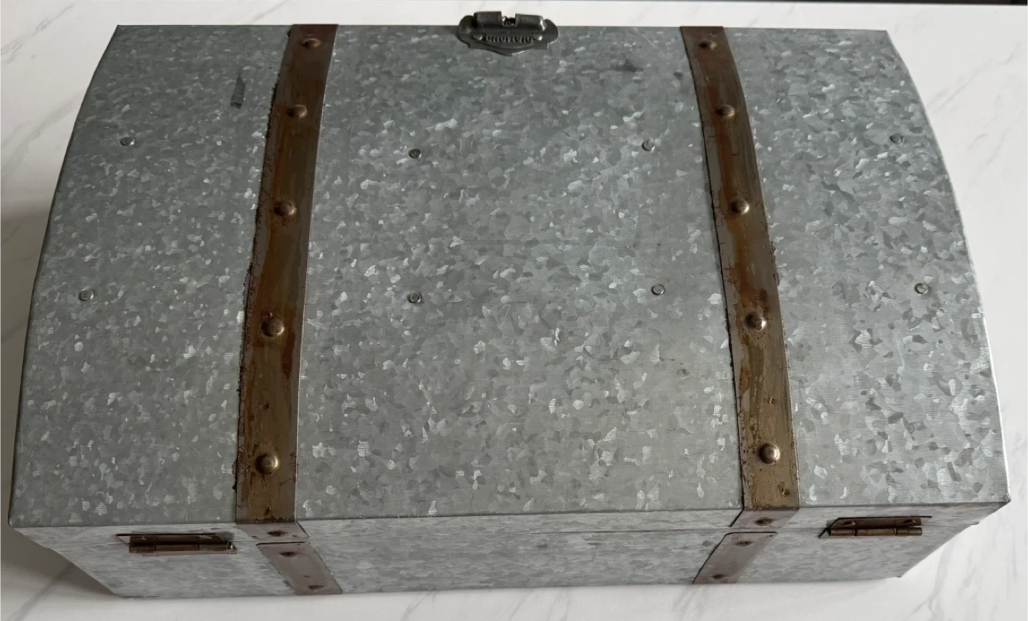 Selling a galvanized metal trunk with a rustic design. The trunk has a latch closure and metal banding with rivet details. It's a great piece for storage or decor!