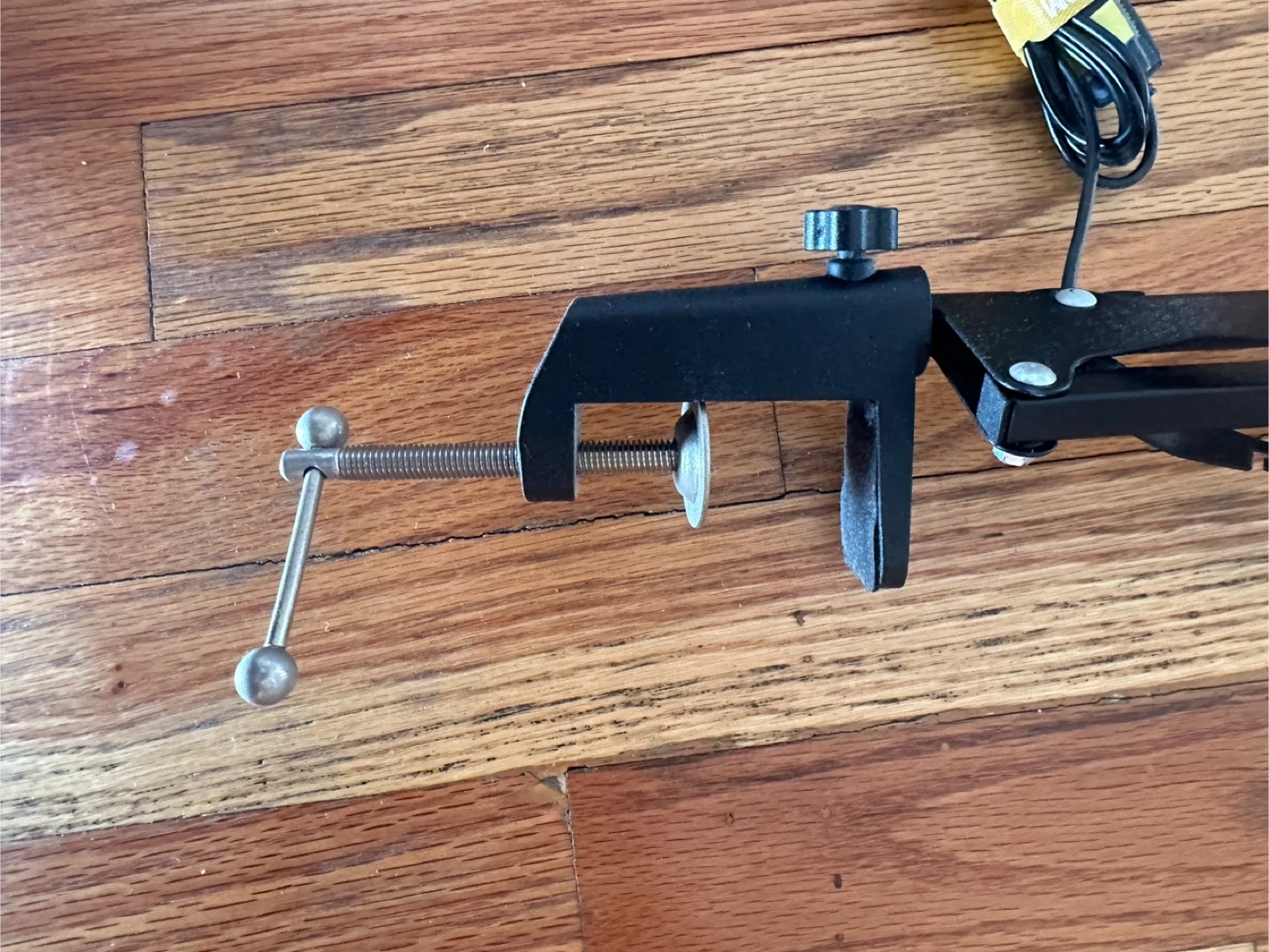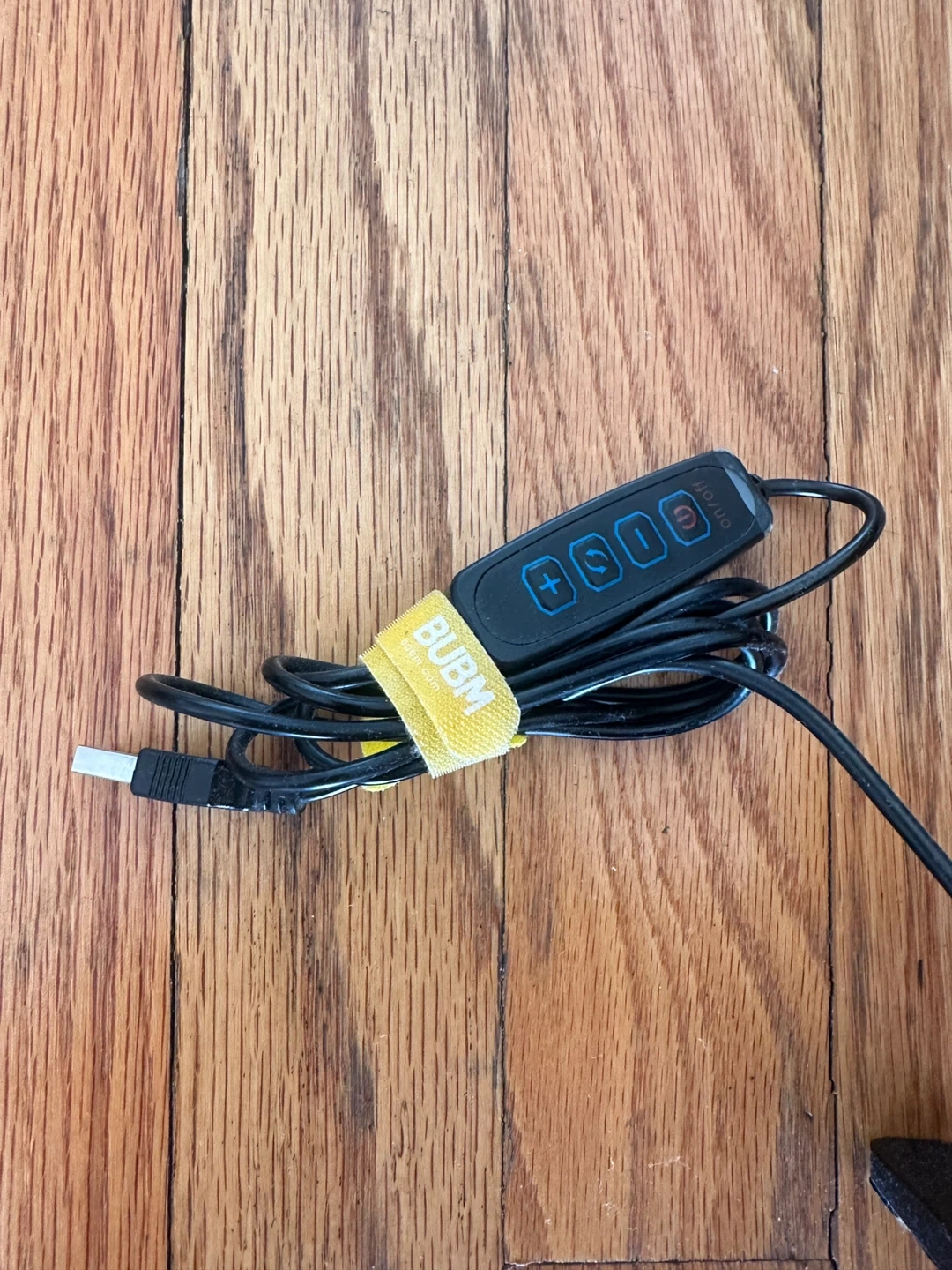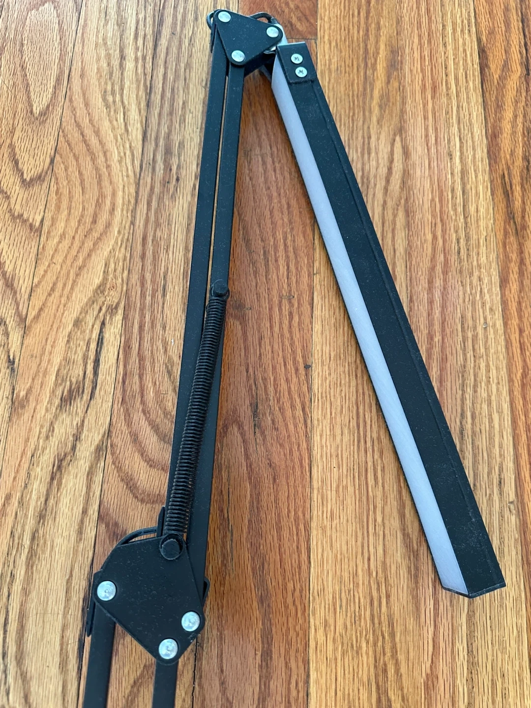Selling a black LED desk lamp. It features an adjustable arm and a clamp for easy attachment to desks or tables. The lamp also comes with a USB cable and a control panel for adjusting the brightness