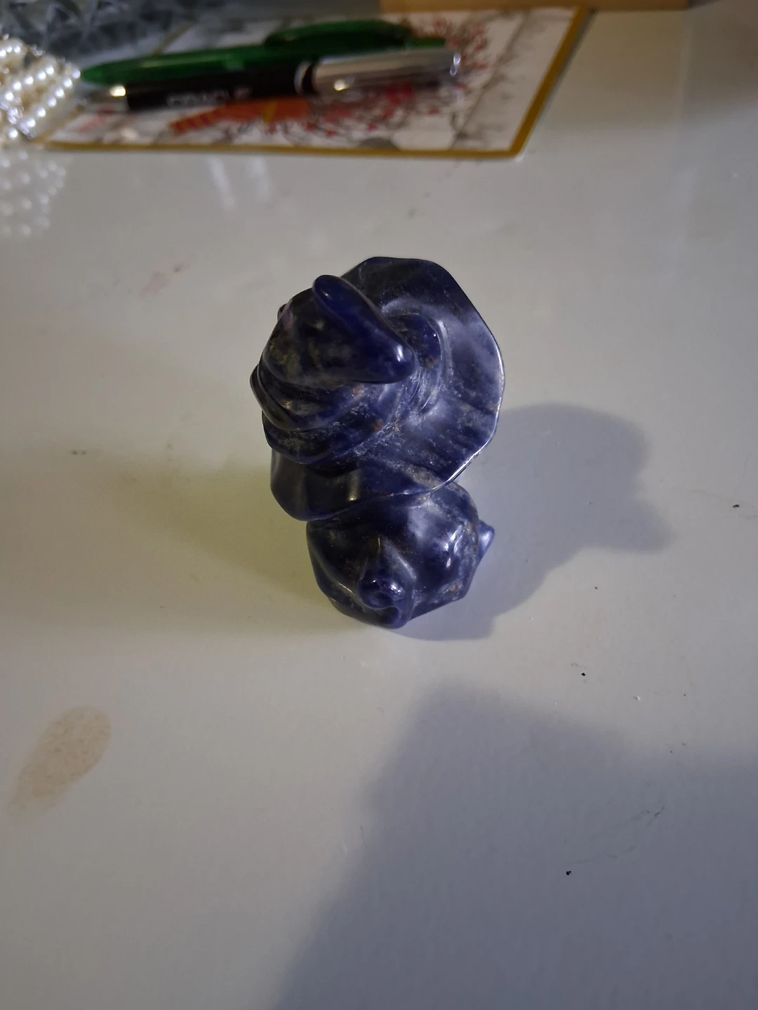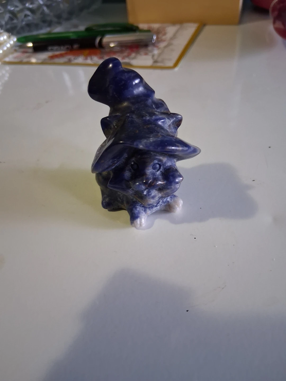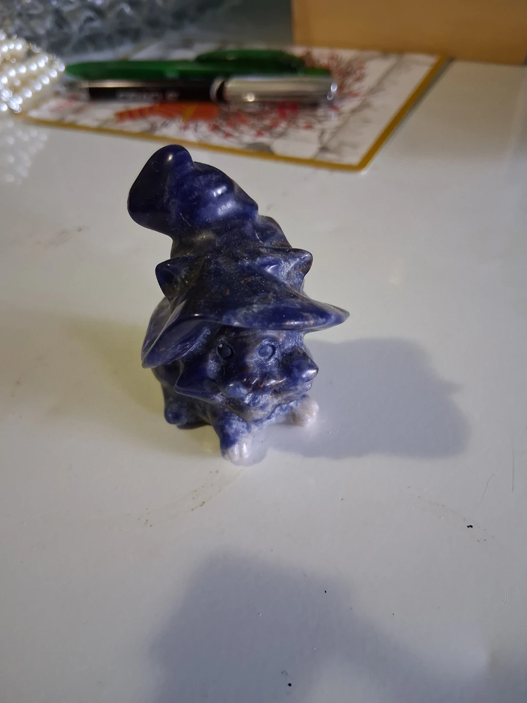 Embrace the magic with this charming, hand-carved sodalite figurine, featuring a cat in a whimsical witch's hat. This unique piece is perfect for those who love all things mystical, spiritual, or simply adore unique gemstone art.