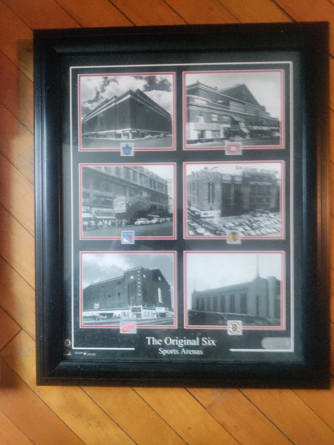 Framed print showcasing "The Original Six Sports Arenas". It features black and white photos of the original hockey arenas. A great piece for any hockey fan!