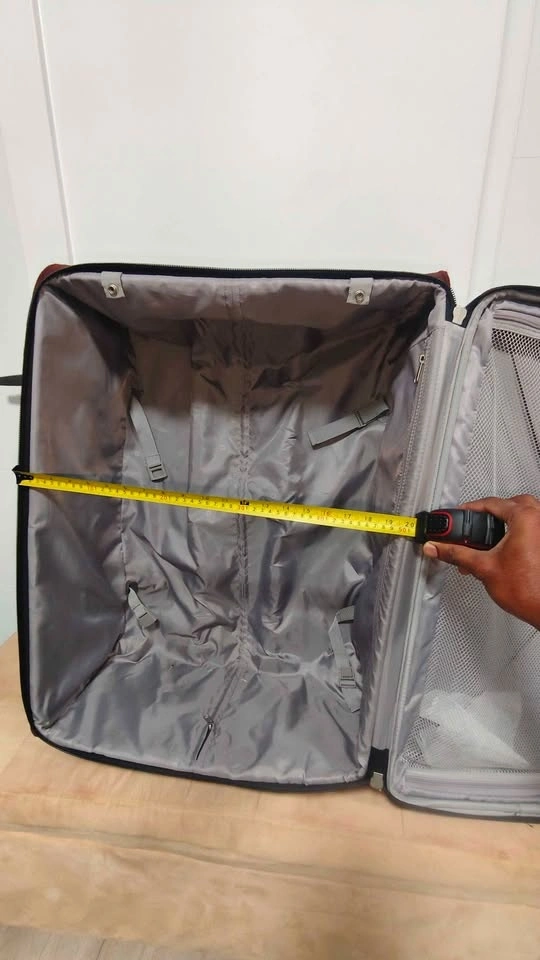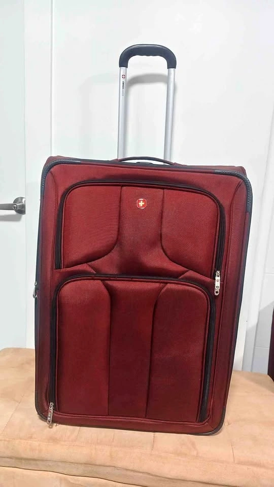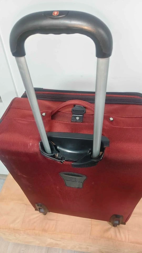 XL Red Swiss Classic suitcase with telescopic handle and wheels. Has multiple pockets and compartments. Top plastic part broke but it does not affect functionality at all. Price reflects this.