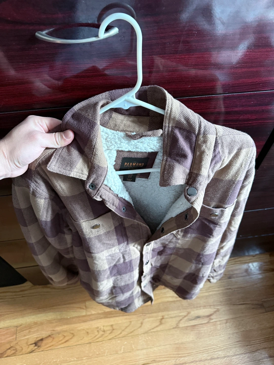 Selling a Redmond flannel shirt jacket with a cozy sherpa lining. It's a stylish and warm piece, perfect for layering during colder weather! The plaid pattern adds a classic touch. Feel free to ask any questions!