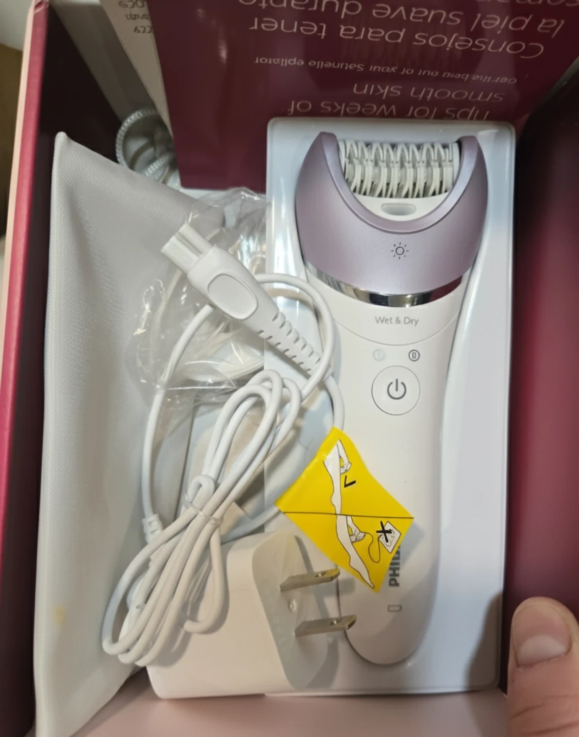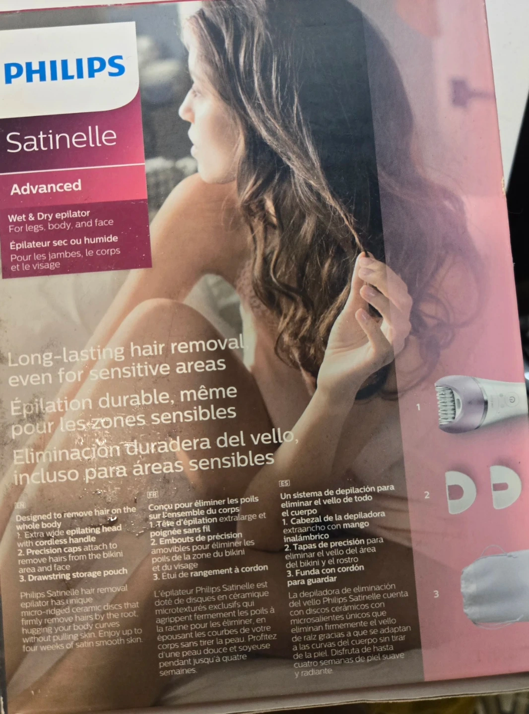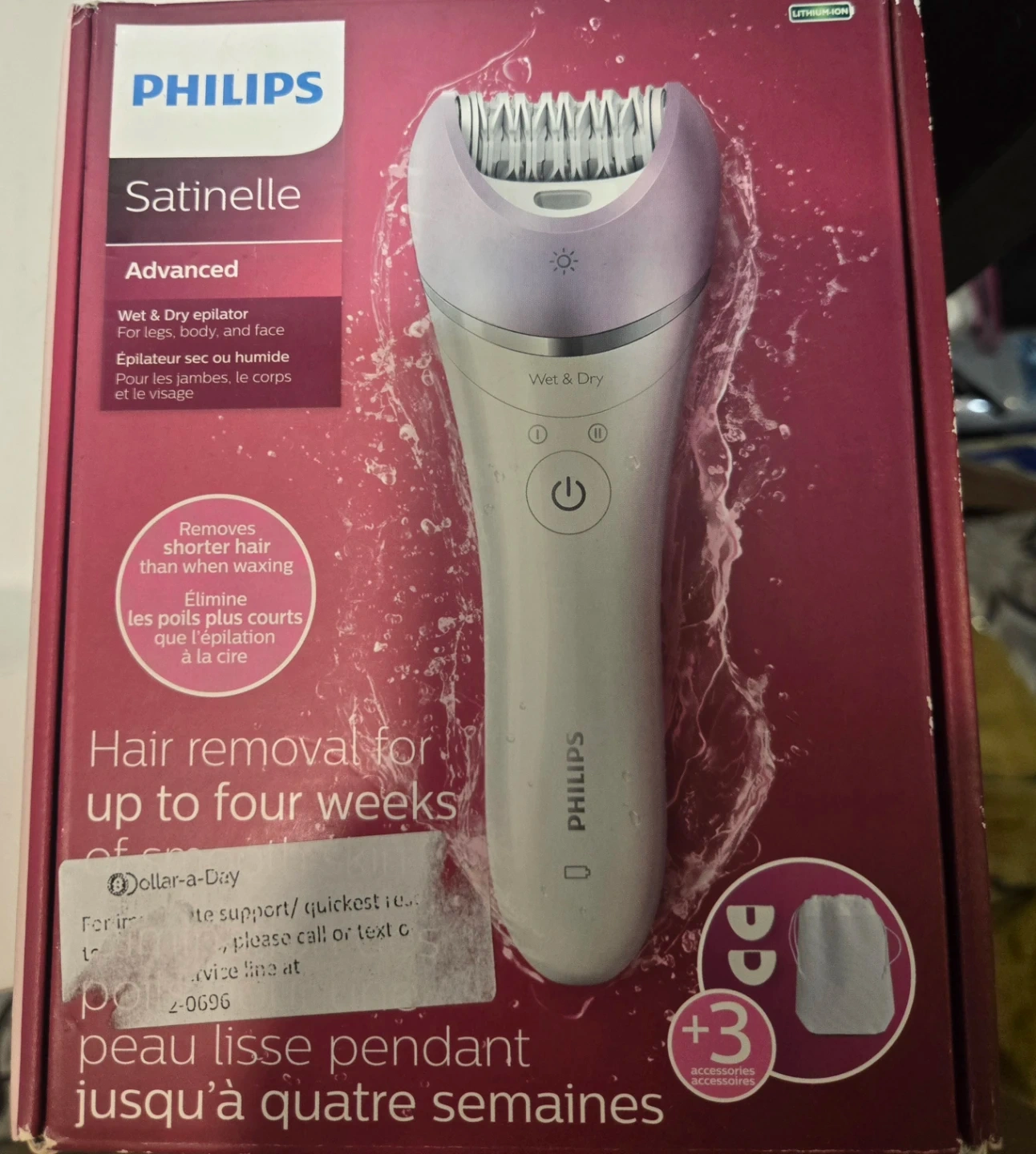 Selling new Philips Satinelle Advanced Wet & Dry epilator. It's designed for legs, body, and face, and removes shorter hair than waxing, providing hair removal for up to four weeks. Includes +3 accessories. Comes with a drawstring storage pouch and is suitable for sensitive areas.