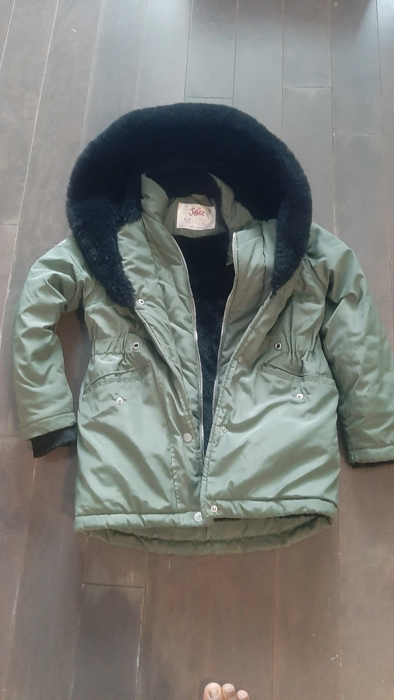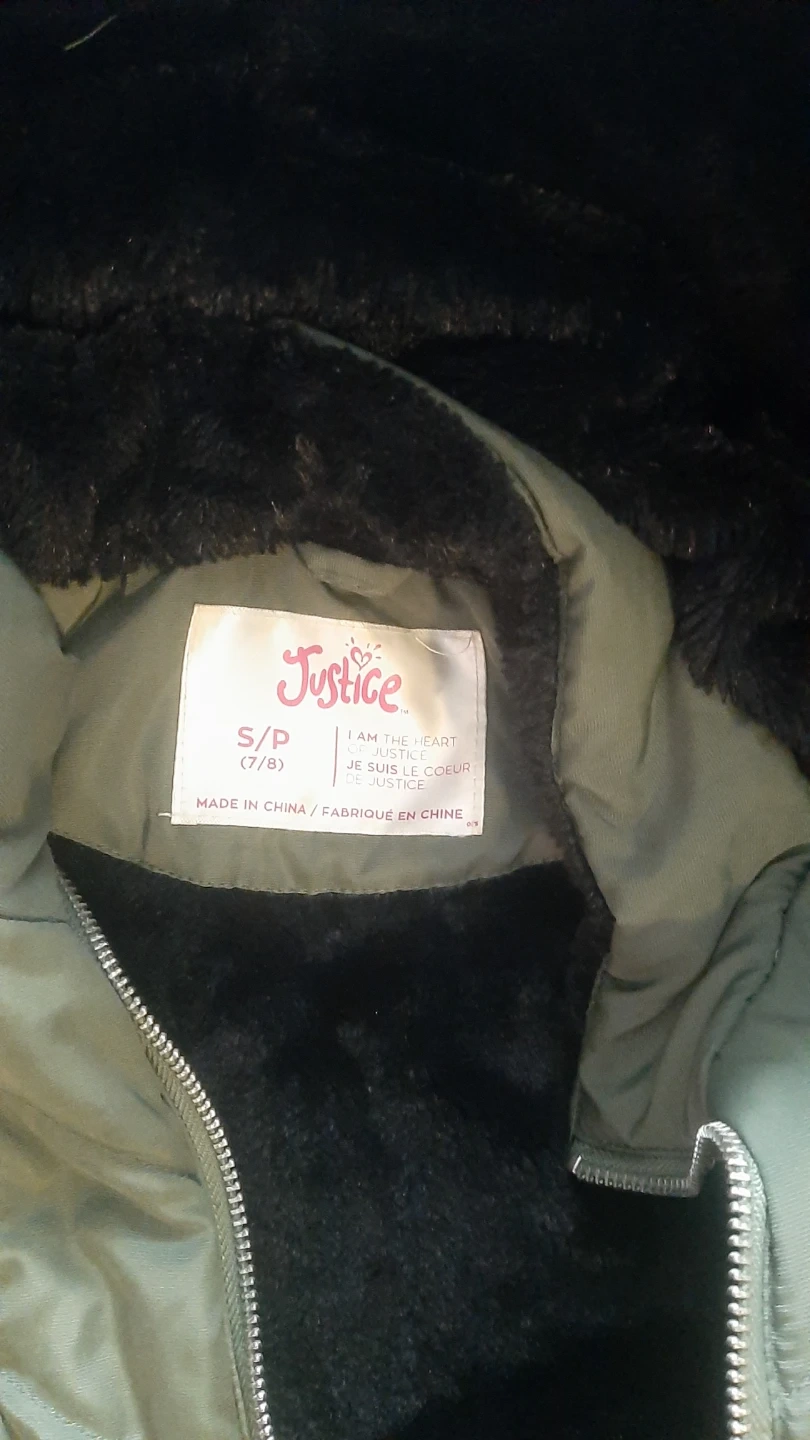 Girls' winter coat from Justice, size S (7/8). The coat is olive green with a black faux fur trim around the hood and inside the jacket. It's in great condition and ready for winter!