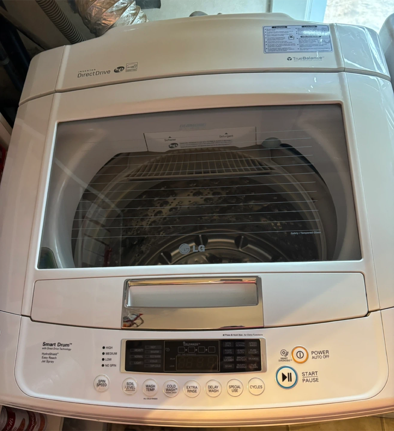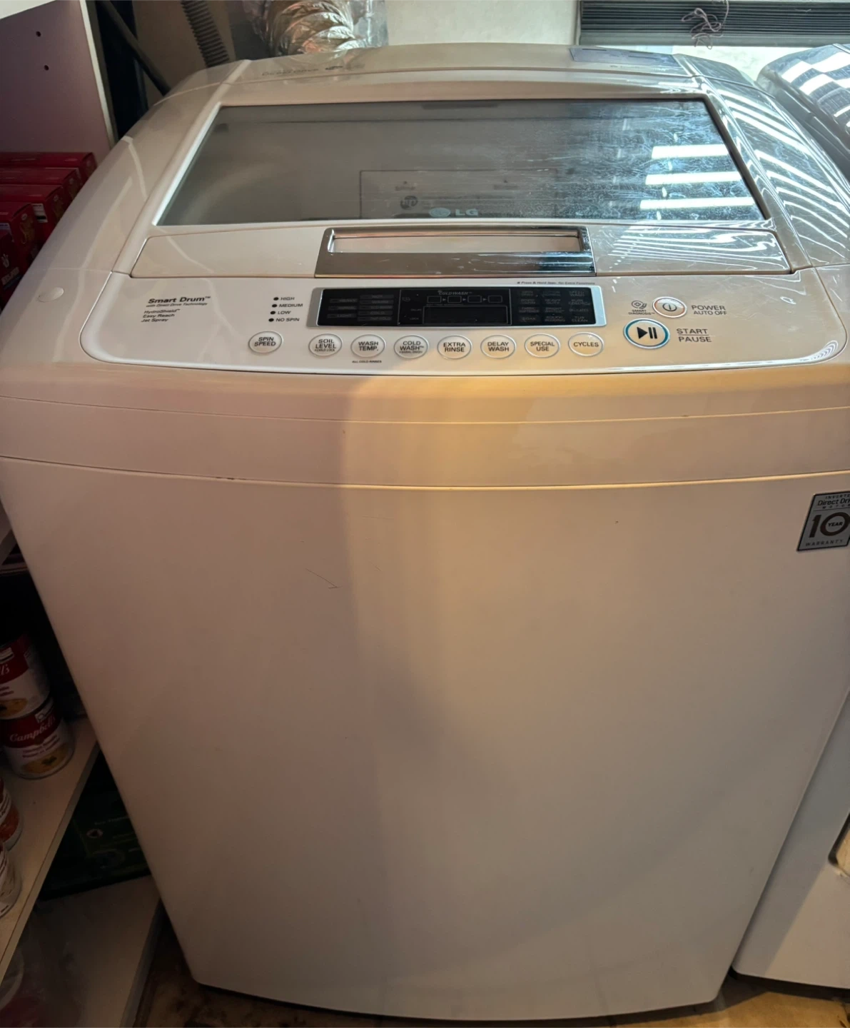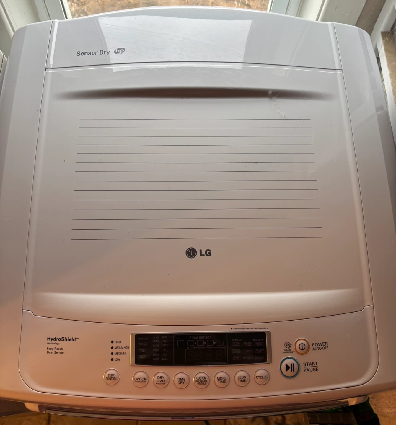 Selling a used LG top load washer. It has a Sensor Dry feature and HydroShield technology. The washer also has a Smart Drum and TrueBalance system. It's in good working condition!