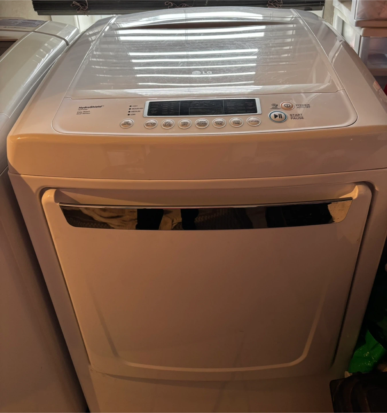 Selling a used LG top load washer. It has a Sensor Dry feature and HydroShield technology. The washer also has a Smart Drum and TrueBalance system. It's in good working condition!