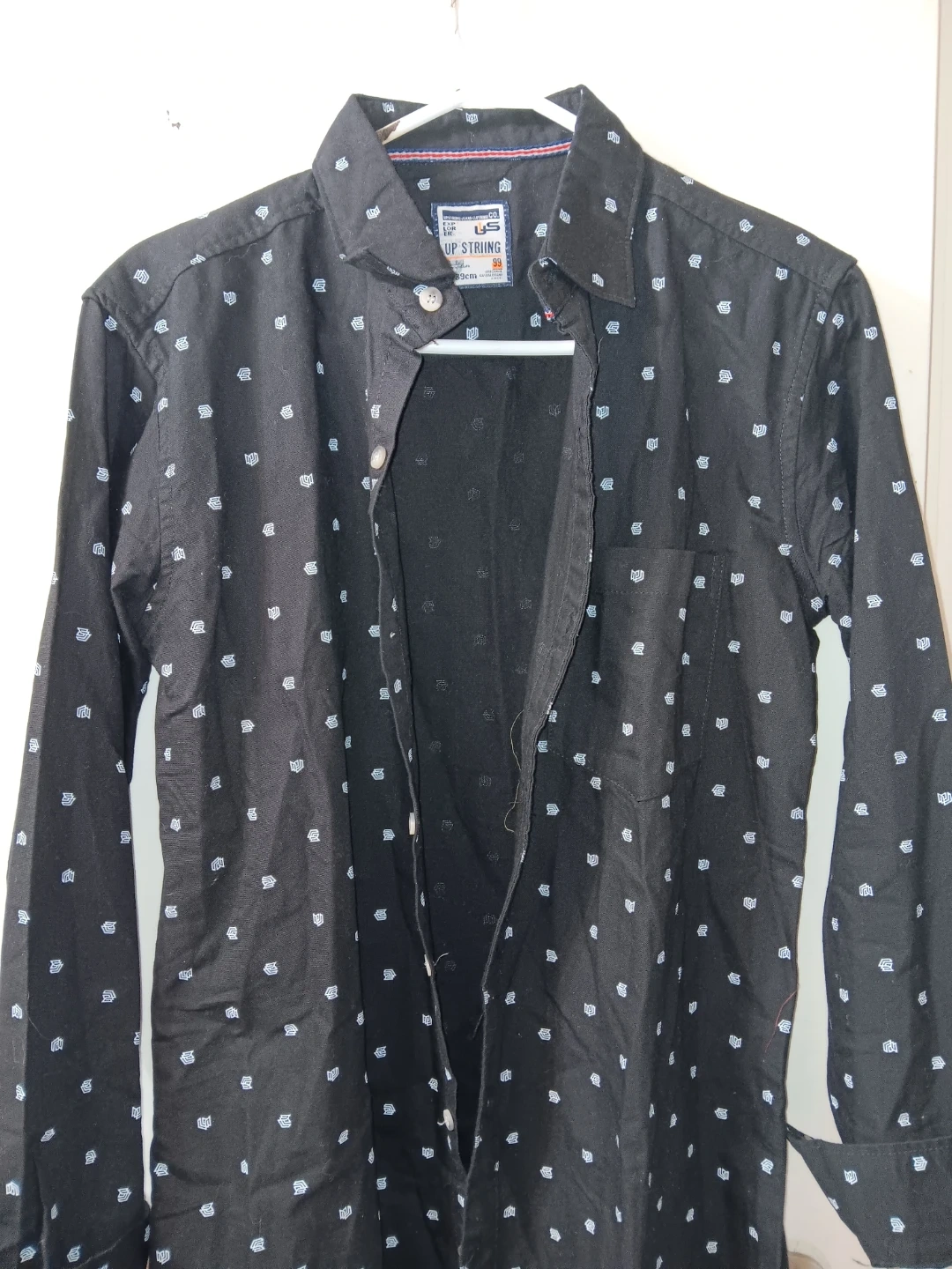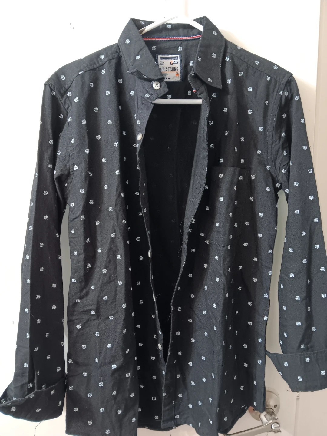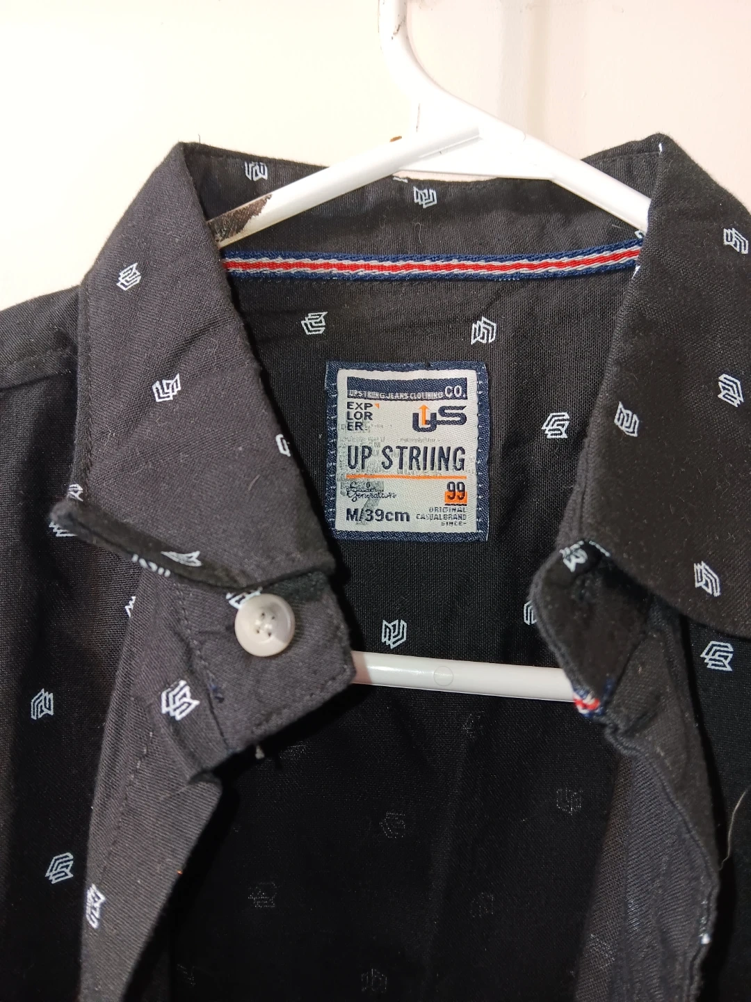 Here's a like-new, long-sleeved shirt from Up Striing! It's a size M/39cm and features a subtle pattern on a Navy blue background. Perfect for adding a bit of style to your wardrobe!