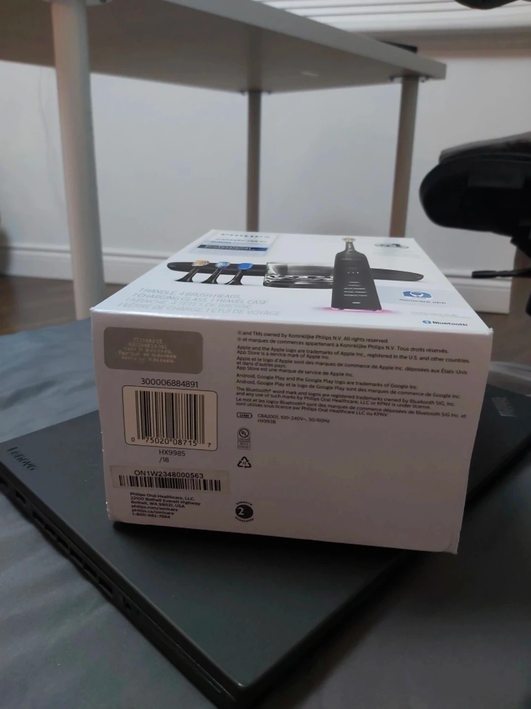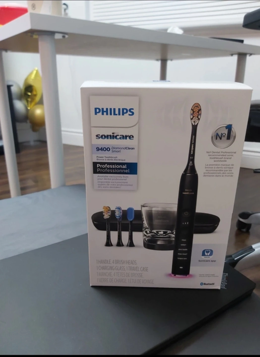This is a brand new Philips Sonicare 9400 DiamondClean Smart electric toothbrush in the original box. It comes with four brush heads, a charging glass, a travel case, a travel brush head, and the toothbrush. It is Bluetooth enabled and includes a Sonicare app.