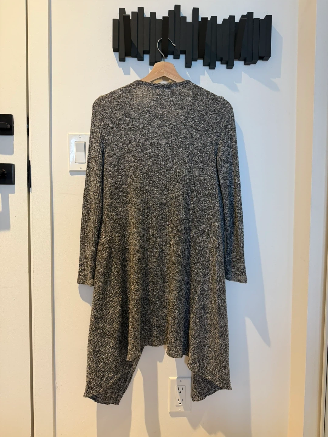 Light cardigan in a grey knit. It's super comfy and great for layering! Perfect for those chilly evenings or just lounging around the house
