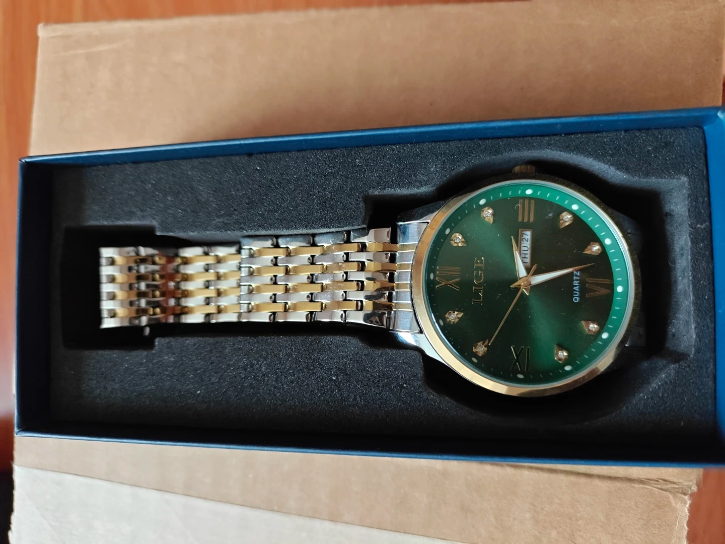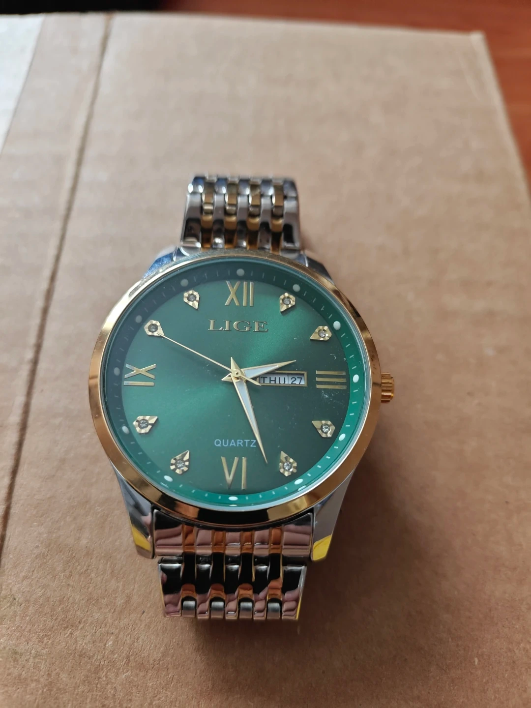 Selling a LIGE quartz watch with a beautiful green face and two-tone gold and silver band. It's in great condition and comes in its original box