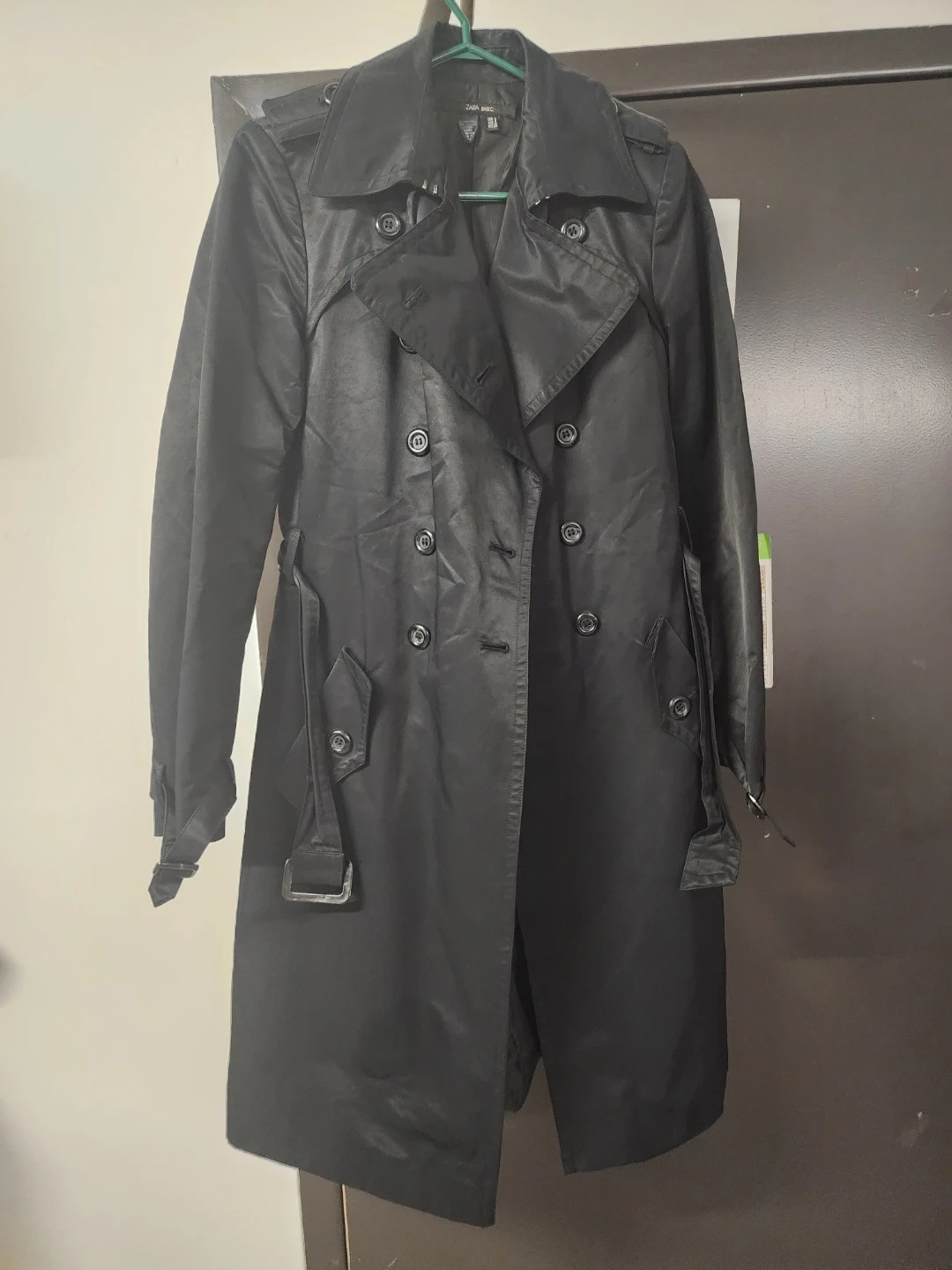 Selling a Zara Basic black trench coat in size small. It's in good condition and ready for a new owner! The outer shell is 73% cotton and 27% nylon, with a lining of 100% acetate