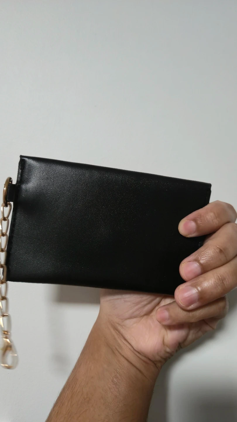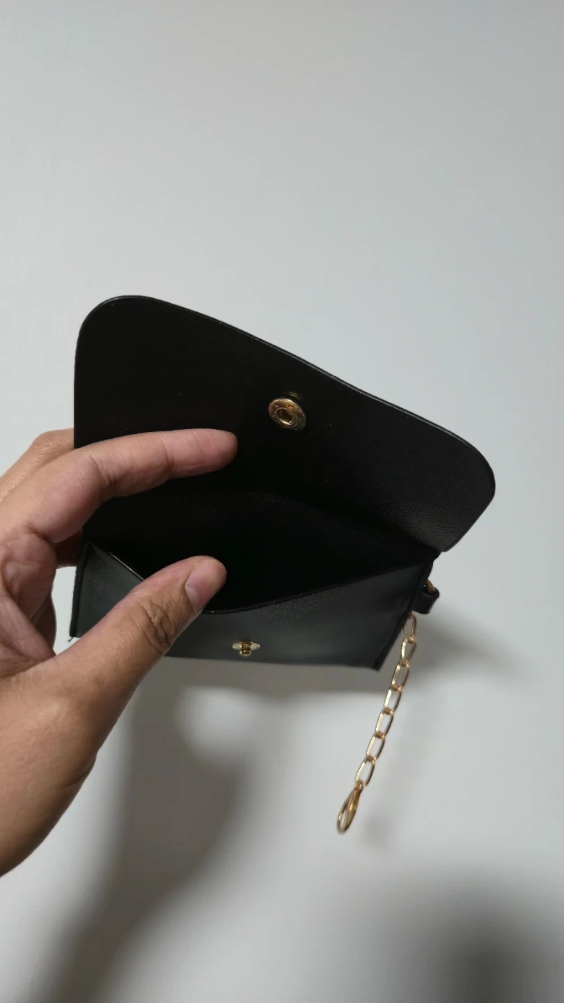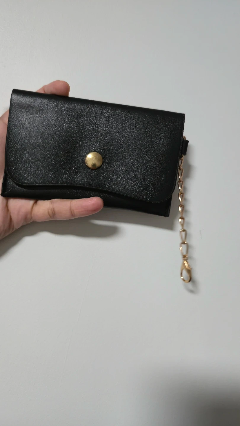 Selling a stylish black wallet featuring a chic gold chain. It's in great condition and perfect for carrying your essentials in a compact and fashionable way. The wallet has a snap closure to keep your belongings secure. A great accessory to add to your collection!