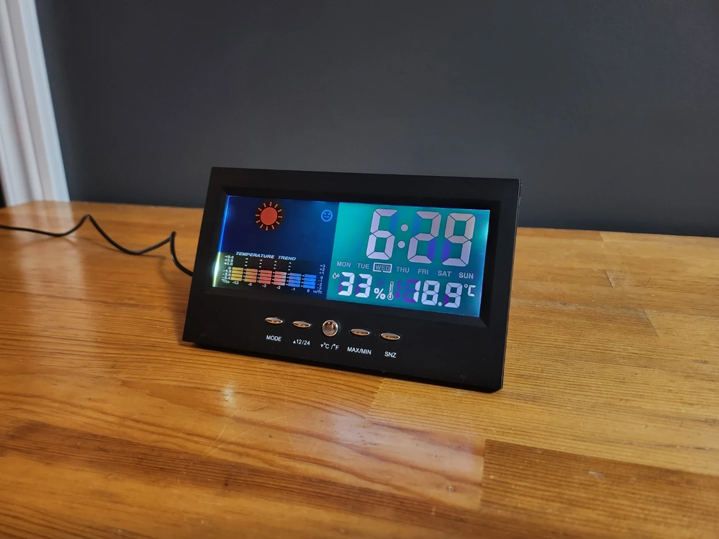Digital LCD weather station clock. It displays the temperature, humidity, and time. Comes with a USB cable for power. Perfect for your desk or bedside table.