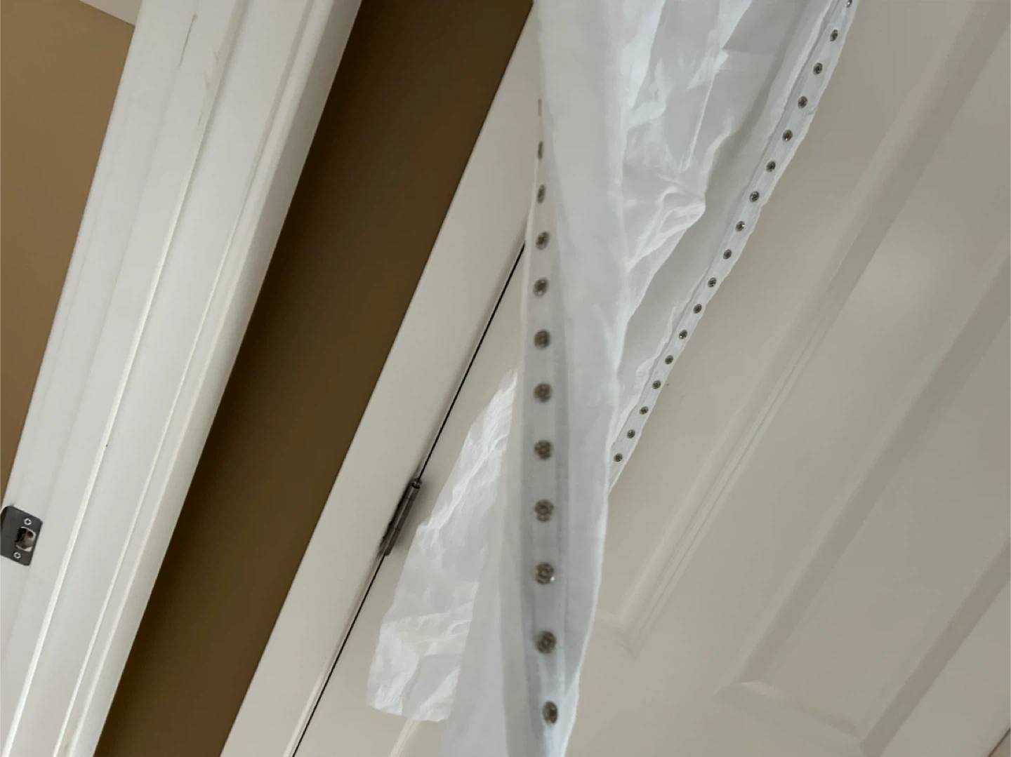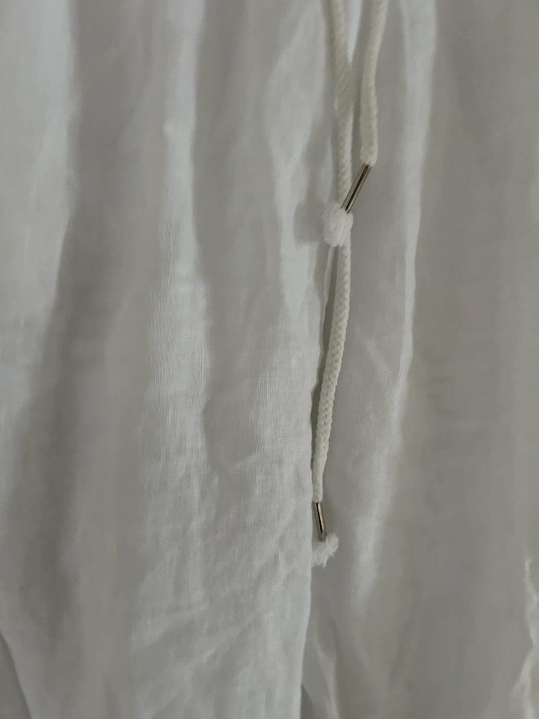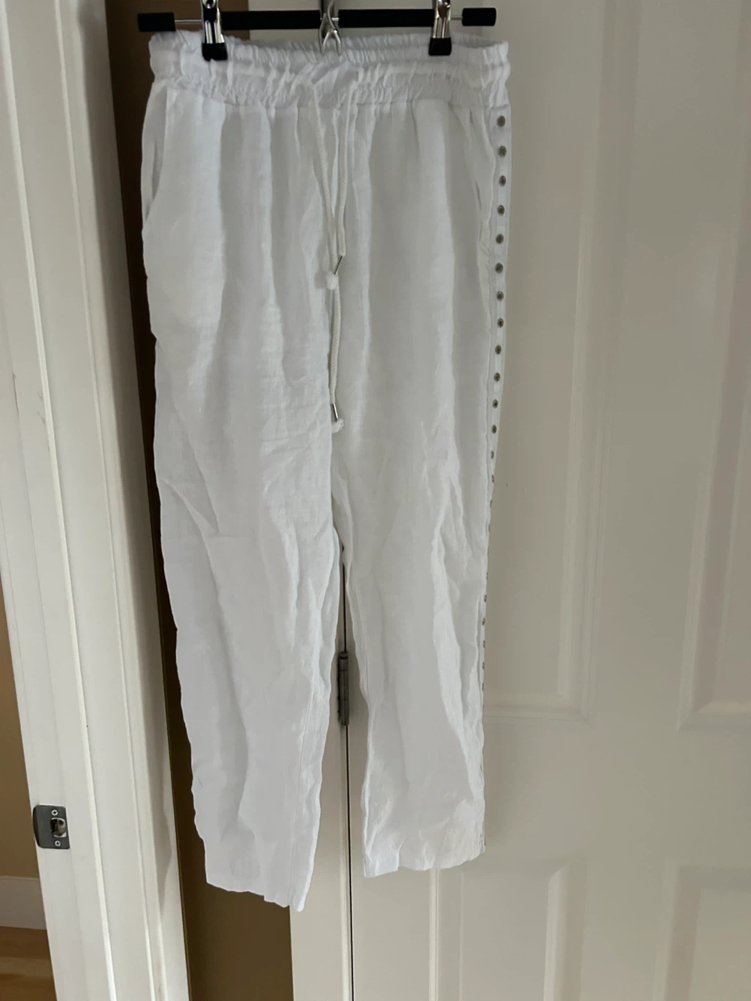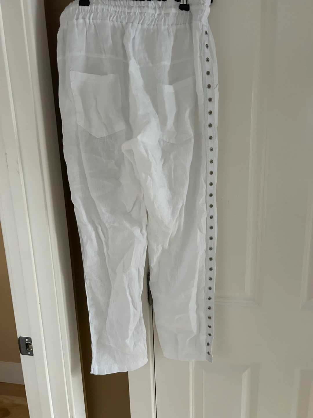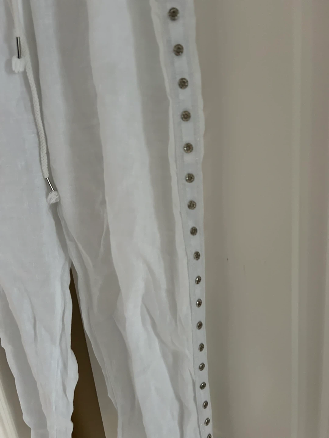 These are a pair of stylish white linen pants. They feature a comfortable drawstring waist and a unique stud detail down the sides. Perfect for a casual summer look!