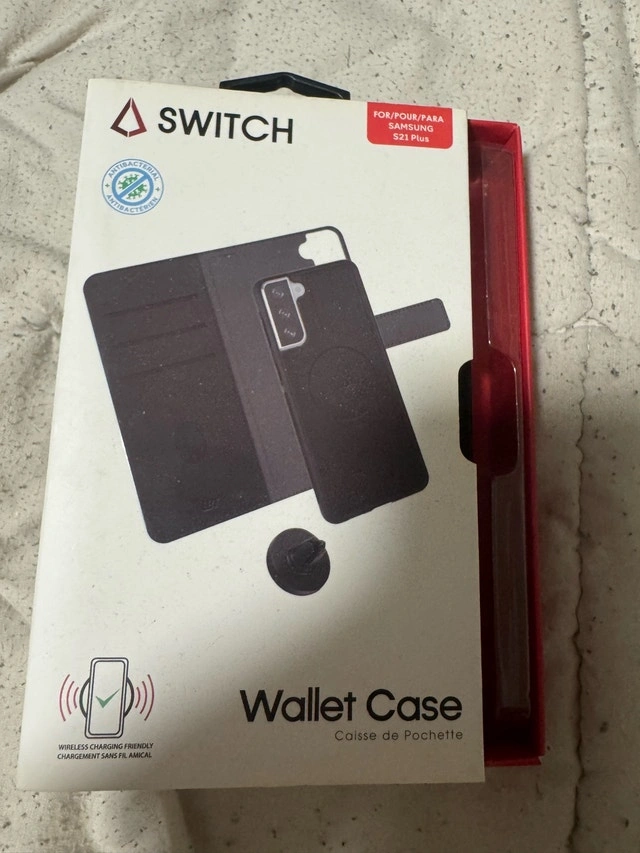 I'm selling a like-new Switch wallet case for a Samsung S21 Plus. This antibacterial wallet case is the perfect way to keep your phone protected and your cards organized. The case is in excellent condition.
