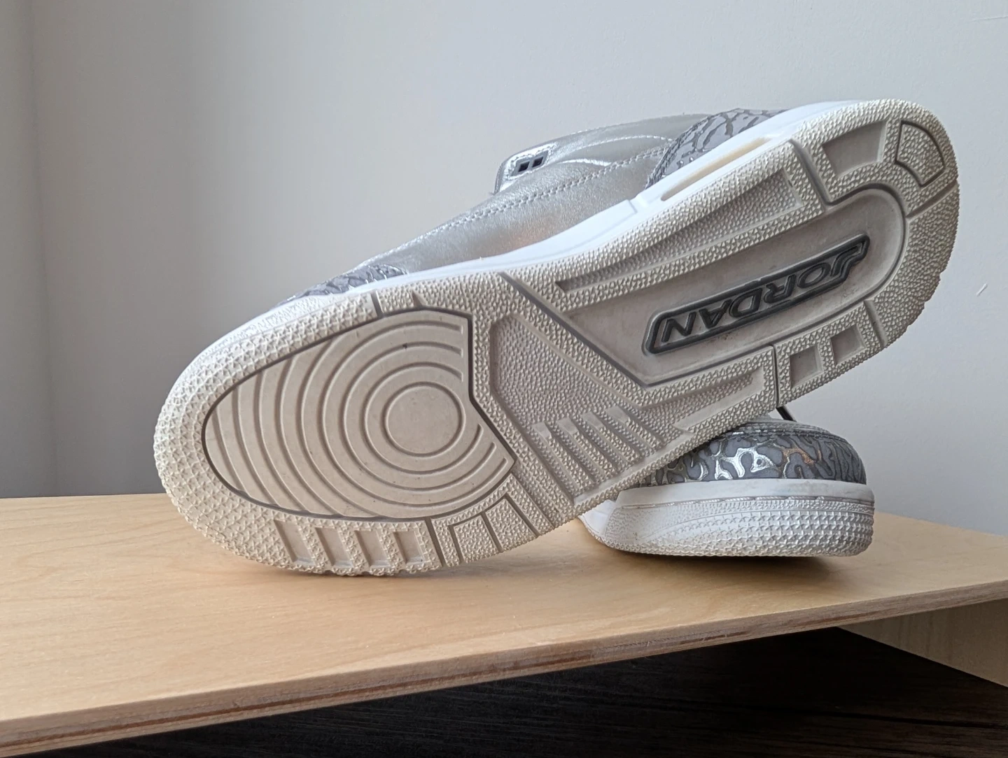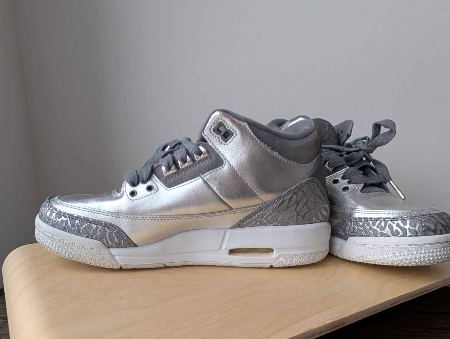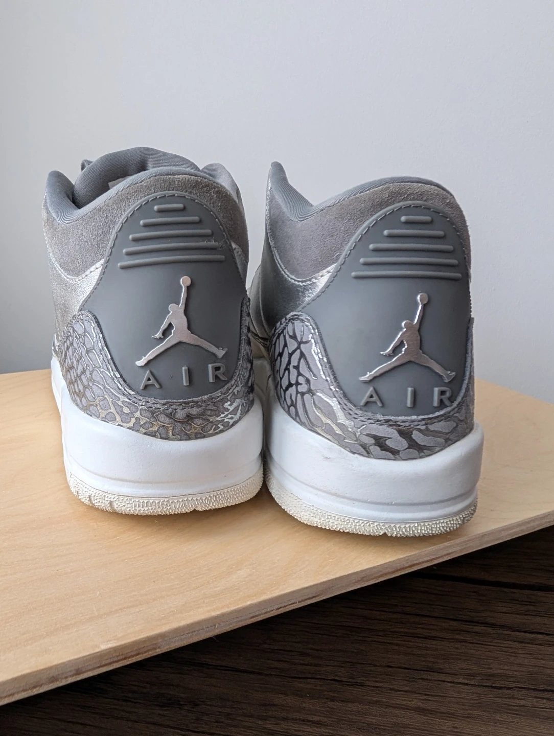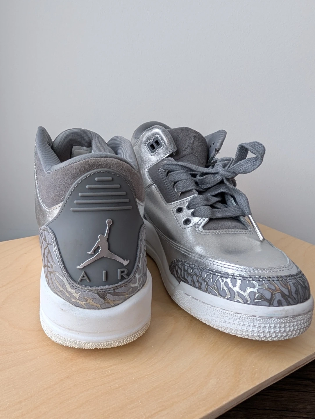 Selling a pair of Air Jordan 3 Retro sneakers in silver and grey! They feature the classic elephant print detailing and the Jumpman logo on the back. The soles are in great shape and ready for wear. A stylish addition to any sneaker collection!