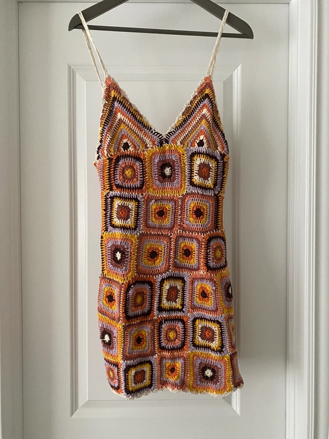 Cute crochet mini dress with a colourful square pattern! It's perfect for summer or layering. Giving “COCHELLA” vibes!