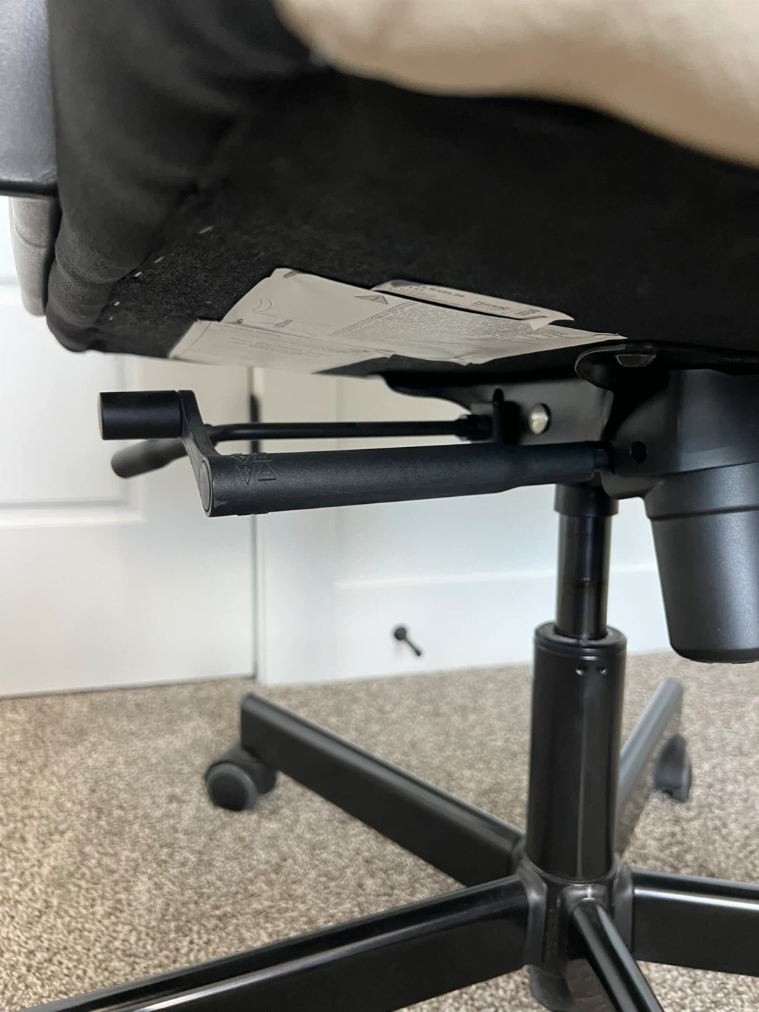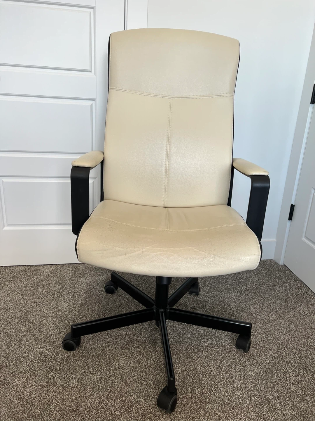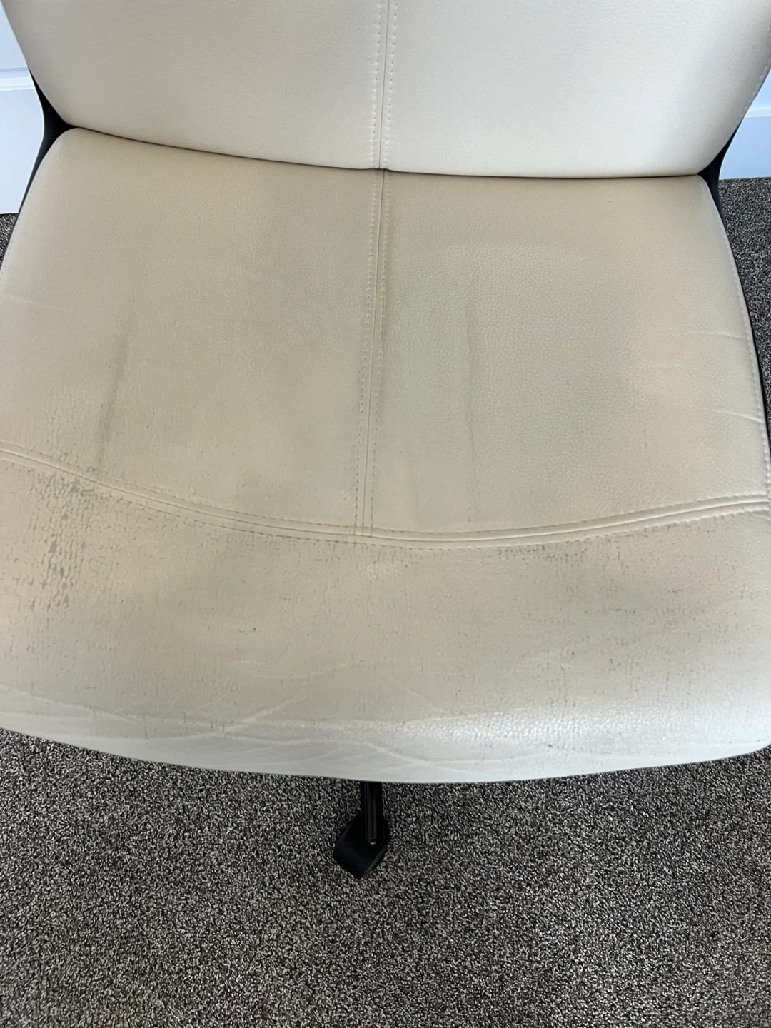 Selling a leather office chair in beige. It shows some signs of wear on the seat, as pictured. Still functions well and is ready for a new workspace.