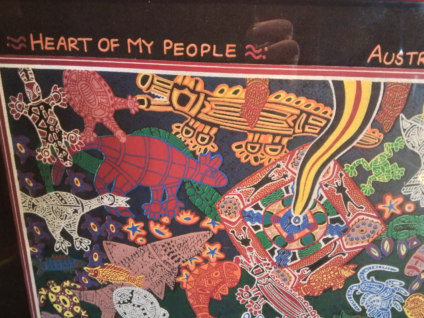 Framed Australian Aboriginal Art by Andrew Williams Burarra. This piece is titled "Heart of My People" and features vibrant colours and intricate designs. It's a beautiful addition to any art collection!