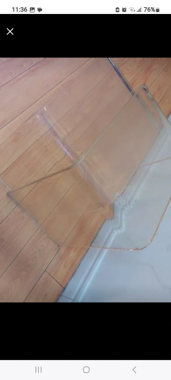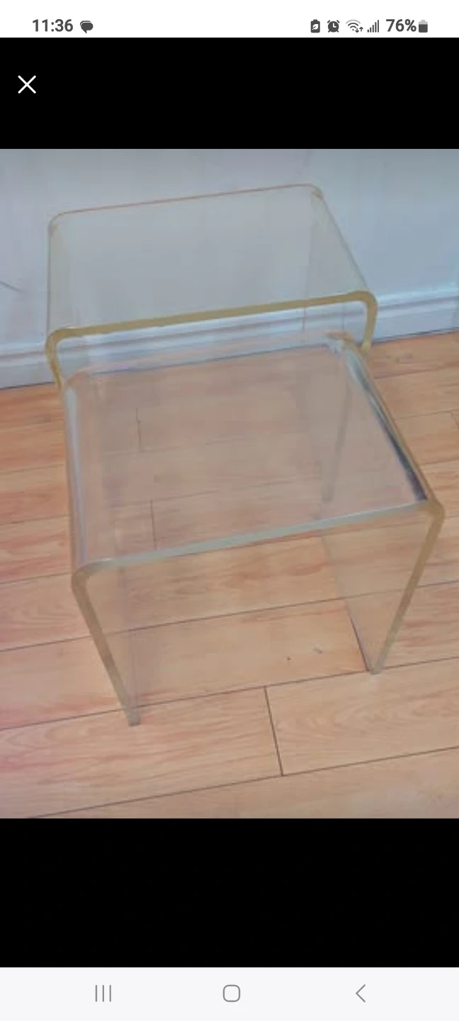 This is a clear vintage lucite side table. It's made of acrylic material. It's a great little table for a plant or a drink!